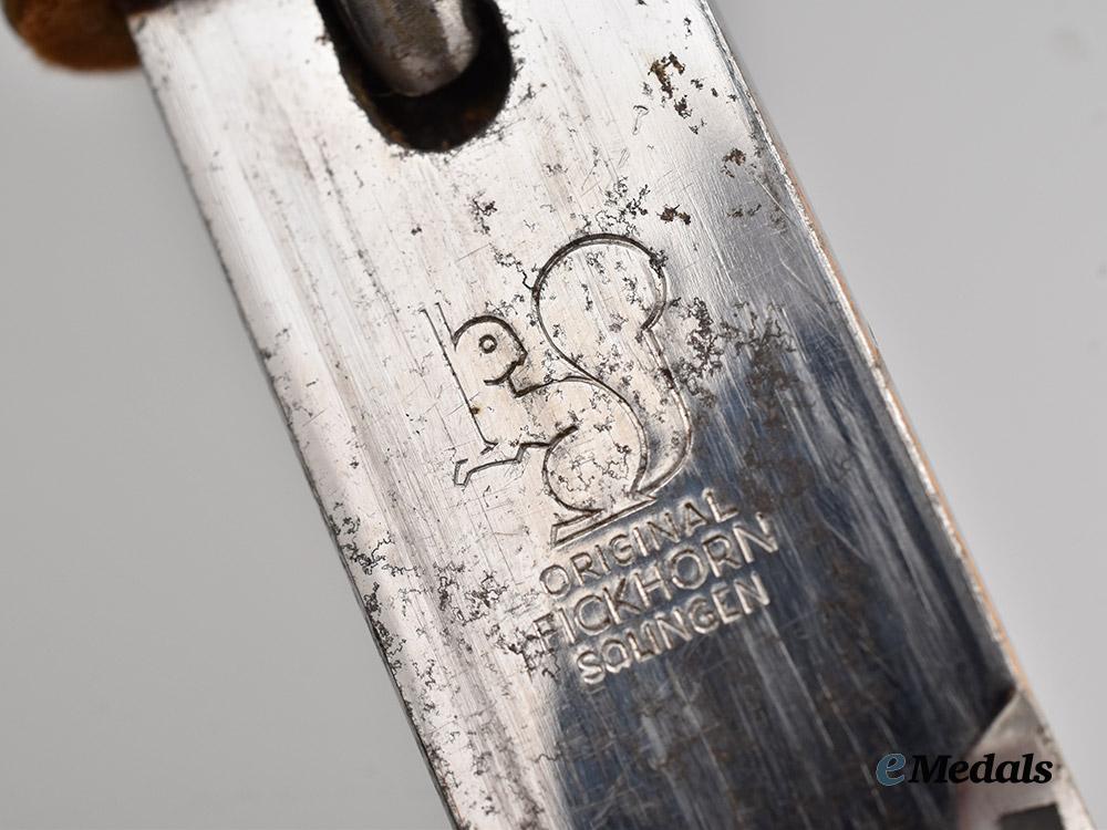 (Kriegsmarine Dolch für Offiziere). A very well-preserved Kriegsmarine Officer’s dress dagger, measuring 42 cm in total length when inserted into the scabbard. It features a 25 cm-long, nickel-plated, magnetic steel dagger which retains factory-original sharpening to both the edges and tip. Dual narrow fullers run the majority of the length of each side of the blade, which also bears double-sided acid-etched designs consisting of central fouled anchors flanked by arabesque and serpentine imagery. The reverse ricasso bears a maker’s mark of “ORIGINAL EICKHORN, SOLINGEN”, topped by the firm’s classic squirrel logo. It sits securely within a gilded bass crossguard which bears double-sided central fouled anchors, with a brown wool buffer pad covering the seam. Inset into the reverse of the crossguard is a functional push button which connects to a clip emanating from the ricasso to release the scabbard lock. A single piece of ribbed off-white celluloid composes the handle grip, with the ribbing retaining an original twisted and rolled wire cord. The dagger culminates in a gilded brass pommel in the form of a German national eagle perched on top of a wreathed mobile swastika, screwing in to maintain the dagger’s structural integrity. Accompanying the dagger is its original scabbard, constructed of a gilded brass shaft decorated with etched imagery around the outer circumference. Two integral oak leaf bands situated just below the throat retain rings for the accommodation of a hanger, while the throat retains a functional catch to lock onto the blade’s clip. Minor issues consistent with age and wear are evident, and include some running marks to the blade and sporadic tarnishing to the scabbard. It remains in an overall extremely fine condition.