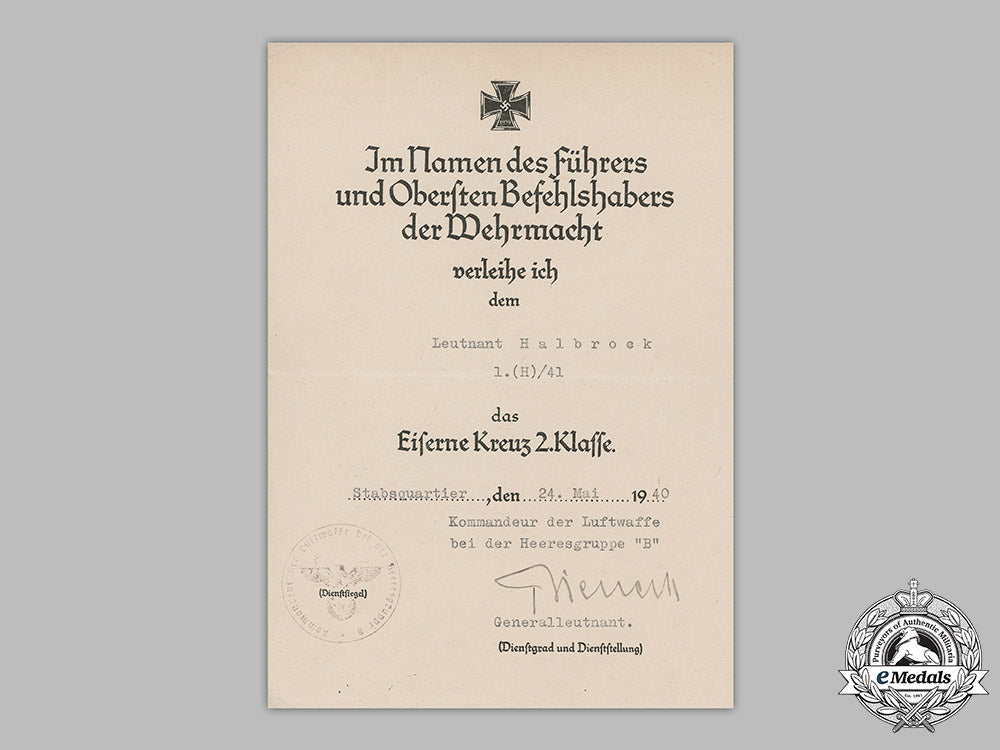 A certificate for an Iron Cross II Class, dated 24 May 1940 and measuring 140 mm (w) x 200 mm (h), in extremely fine condition;