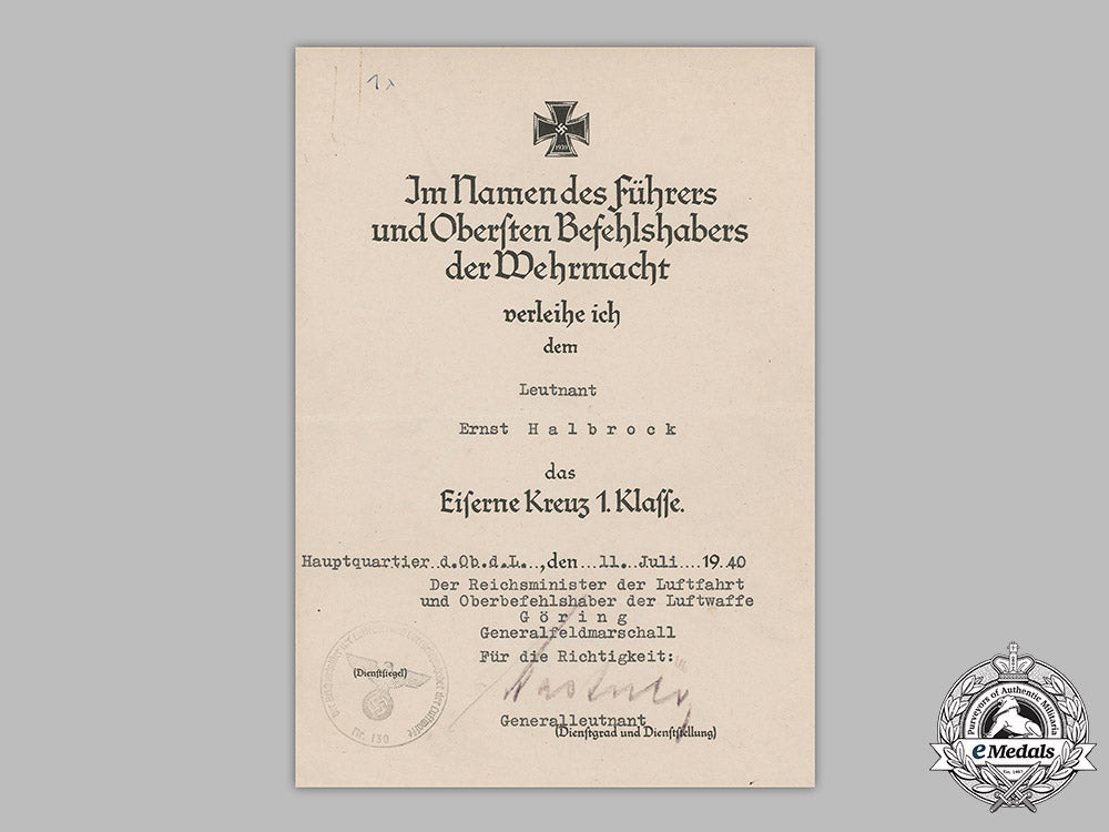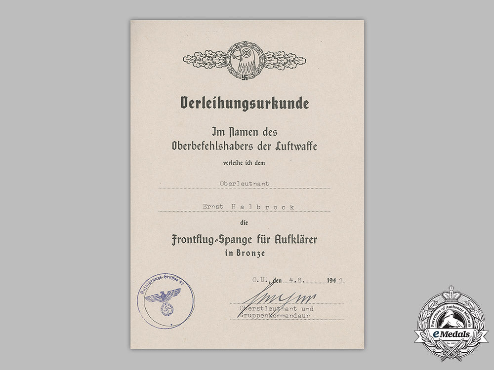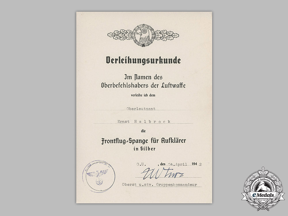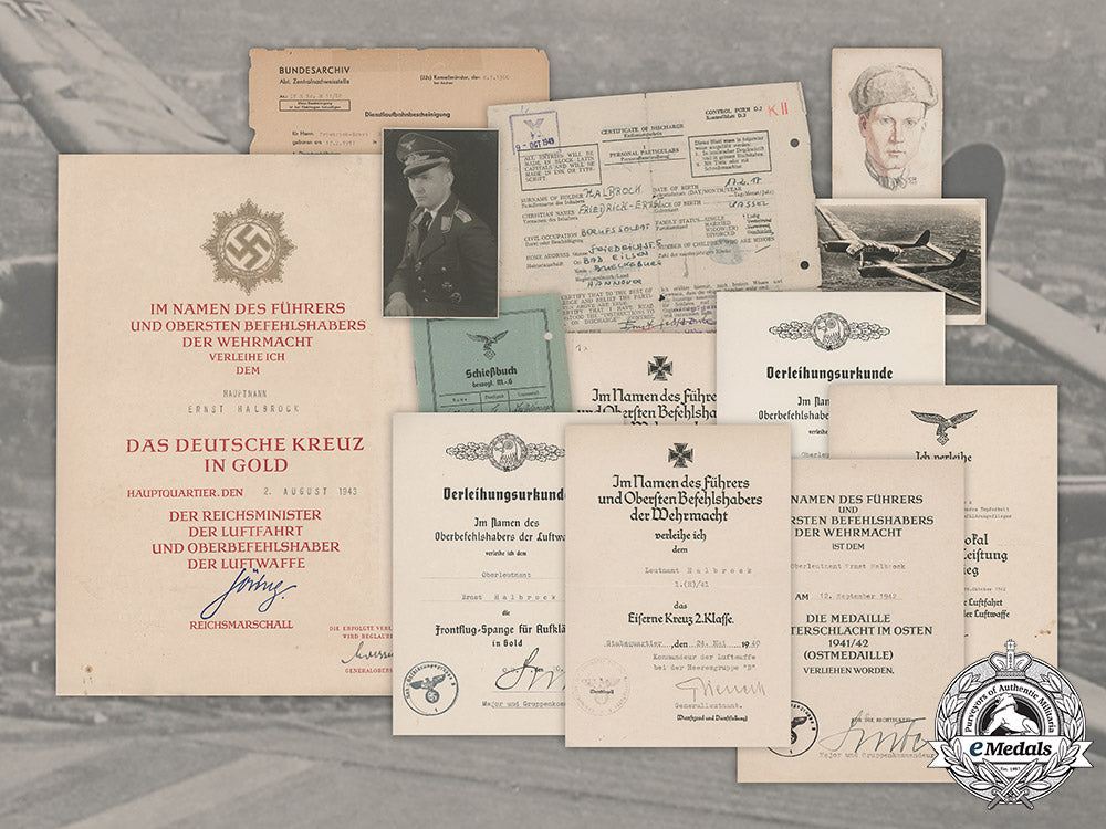 Germany, Luftwaffe. A Collection Of Documents To Honour Goblet Recipient Ernst Halbrock