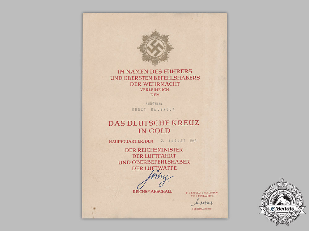 A certificate for a German Cross in Gold, signed by Reichsmarschall Hermann Göring, dated 2 August 1943 and measuring 253 mm (w) x 355 mm (h), in extremely fine condition.