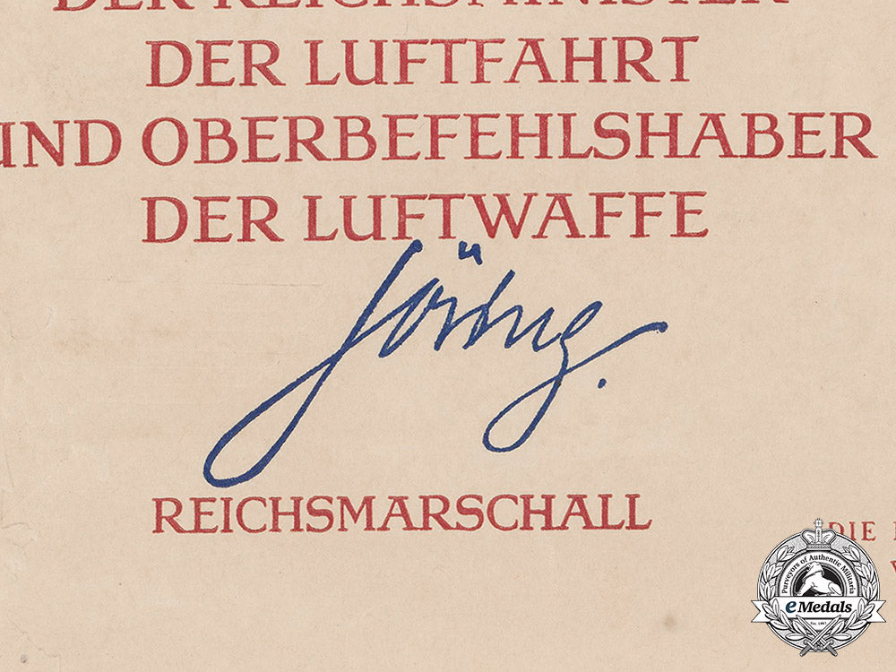 A certificate for a Luftwaffe Honour Goblet, signed by Reichsmarschall Hermann Göring, dated 19 October 1942 and measuring 209 mm (w) x 297 mm (h), in near extremely fine condition.