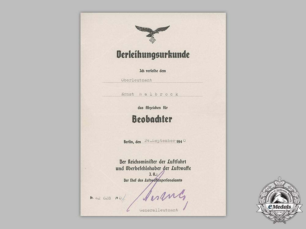 A certificate for a Luftwaffe Observer Badge, dated 24 September 1940, measuring 149 mm (w) x 209 mm (h), in extremely fine condition;