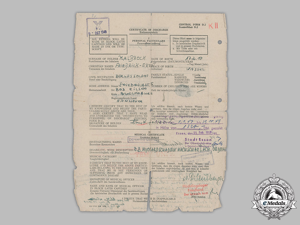 Also included is a discharge certificate, indicating that Halbrock was discharged from the Luftwaffe after captivity on 9 October 1949, and was unfit for further military service due to heart problems. It measures 212 mm (w) x 274 mm (h) and displayed moderate material fatigue; in overall near very fine condition.