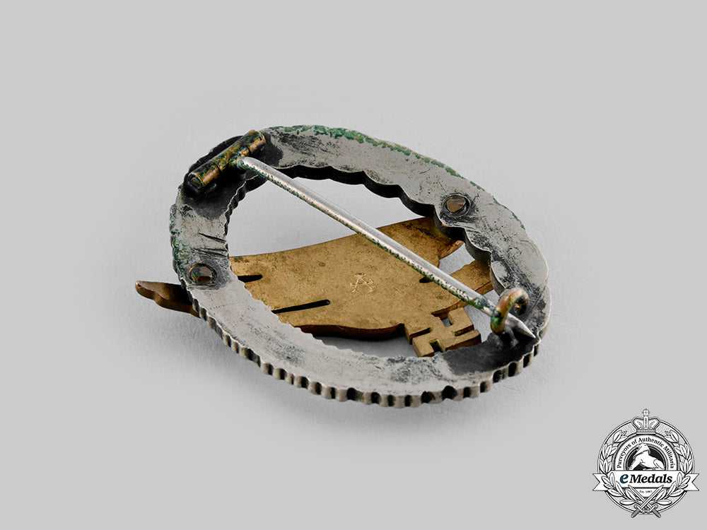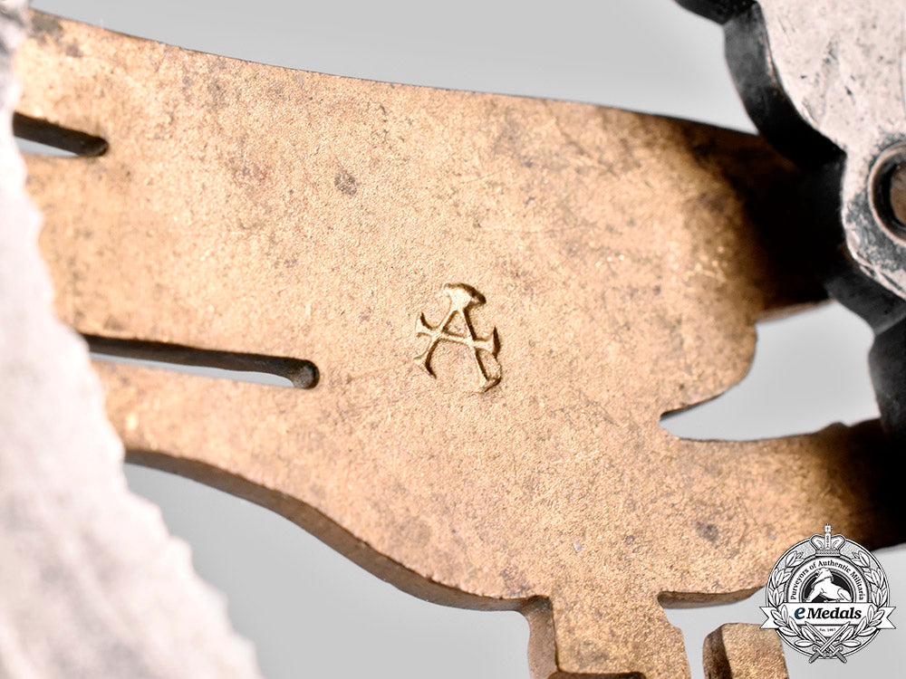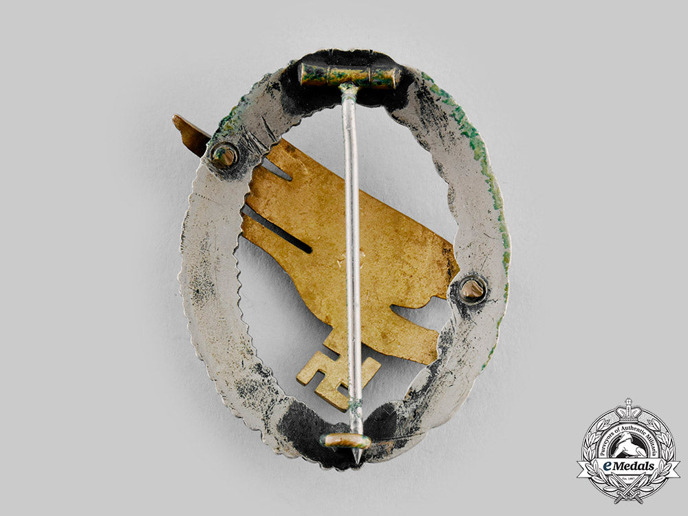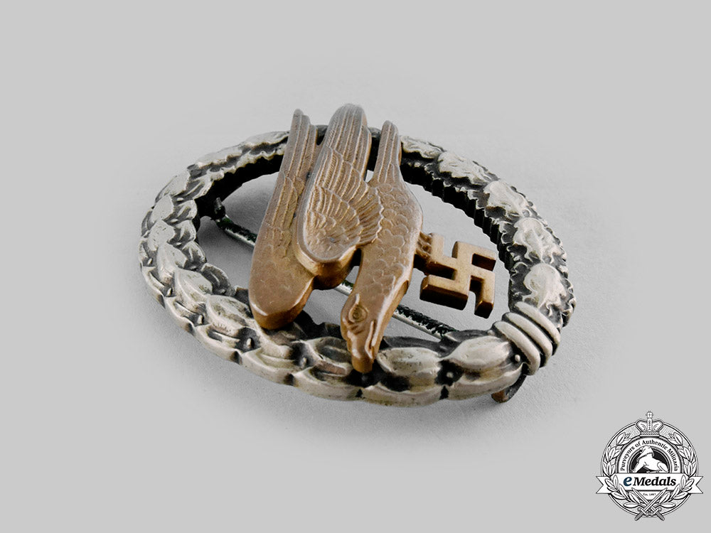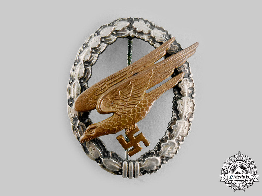(Luftwaffe Fallschirmschützenabzeichen). Consisting of an oval nickel silver wreath, with laurel leaves on the left half of the wreath, and oak leaves on the right half of the wreath; with a gilt bronze eagle attached to the obverse via two rivets visible on the reverse, clutching a mobile swastika in its talons; the reverse plain, with a vertical needle pin, a barrel hinge, and a round wire catch; marked with the logo of “F.W. Assmann & Söhne” on the reverse; measuring 42.20 mm (w) x 53.15 mm (h); weighing 36.4 grams, exhibiting period wear to reverse, worn, remains near very fine.