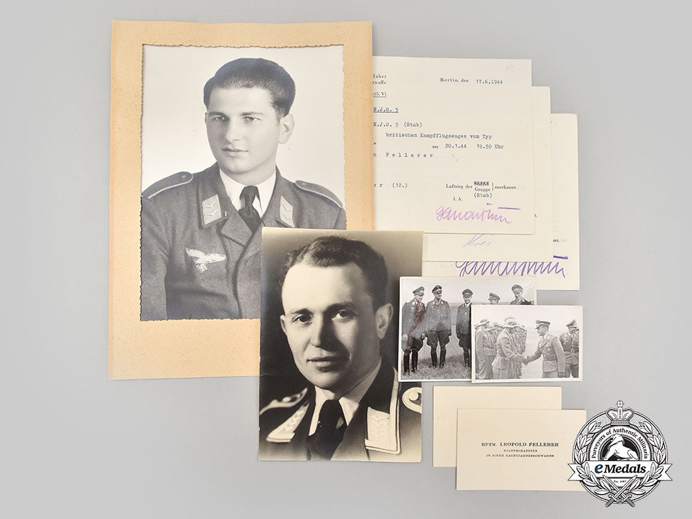 (Luftwaffe Papiere und Fotos). A mixed lot of nine documents and photographs to Leopold Fellerer, a Luftwaffe night fighter ace and recipient of the Knight’s Cross of the Iron Cross, including: