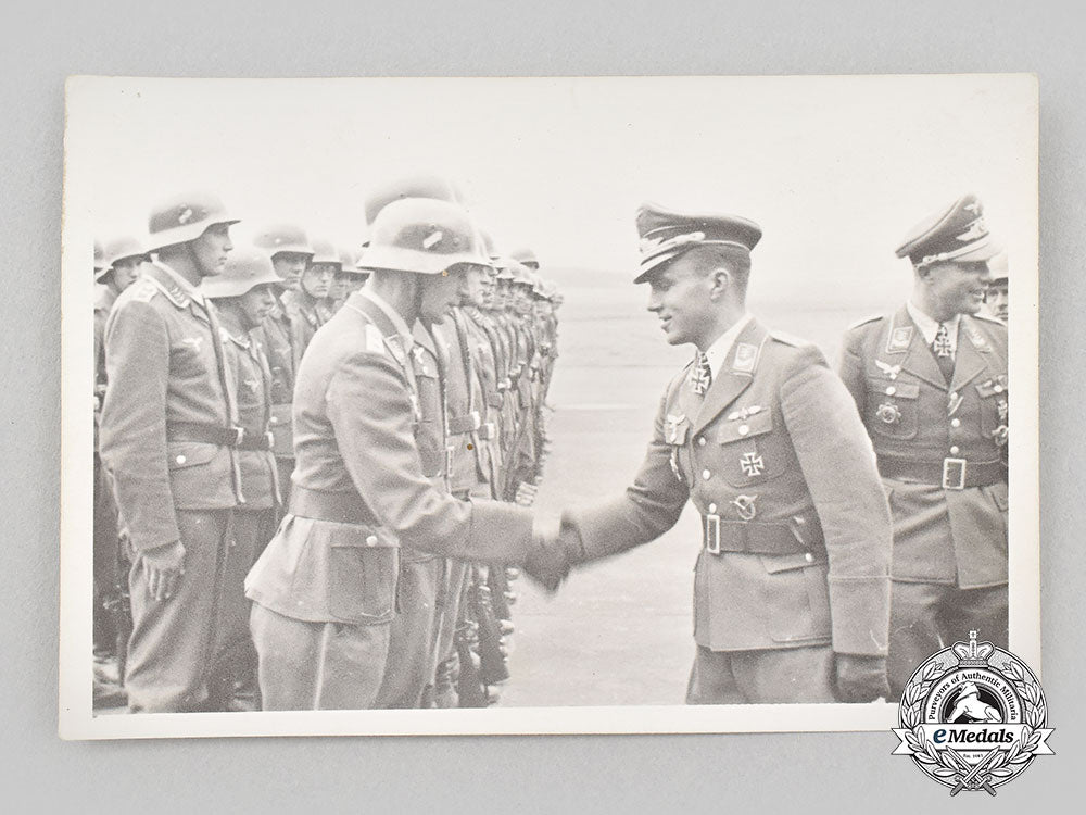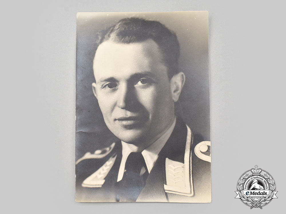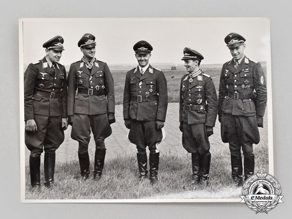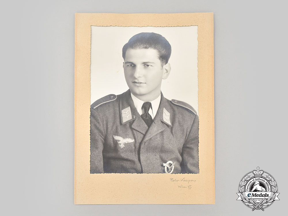 5. A group of four photos, including a large studio portrait of a young Fellerer, depicted in the uniform of a Luftwaffe Gefreiter and wearing a Pilot’s Badge, set within a light brown card stock frame bearing a handwritten studio mark of “FOTO-KASPER, WIENN VII” at the lower right corner of the obverse, measuring 210 mm (w) x 290 mm (h), a razor-sharp image in extremely fine condition; a small studio portrait of Fellerer in the uniform of a Luftwaffe Oberfeldwebel, printed on unmarked wartime photo paper, measuring 130 mm (w) x 182 mm (h), in extremely fine condition; a photo depicting Fellerer with a group of four other Luftwaffe Officers wearing Knight’s Crosses with a variety of other decorations, printed on glossed Agfa-Brovira paper, unmarked, measuring 115 mm (w) x 85 mm (h), a superb image of decorated Luftwaffe pilots in extremely fine condition, and; a small photo depicting Fellerer greeting an assembly of Luftwaffe personnel wearing Stahlhelme, printed on matte Agfa-Brovira paper, unmarked, measuring 92 mm (w) x 62 mm (h), in extremely fine condition.