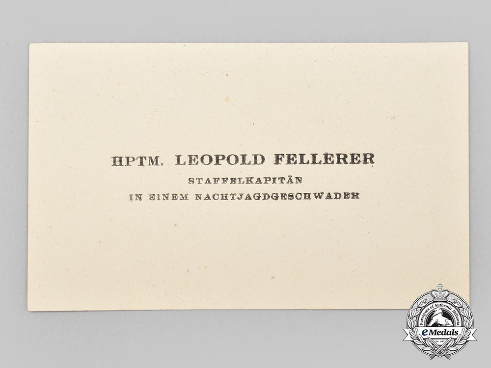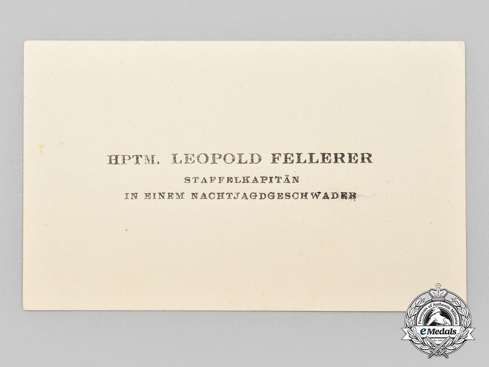 4. Two wartime calling cards, each constructed of off-white card stock, the obverse of both bearing a typewritten dedication of “HPTM. LEOPOLD FELLERER, STAFFELKAPITÄN IN EINEM NACHTJAGDGESCHWADER”, each measuring 105 mm (w) x 64 mm (h), in extremely fine condition.