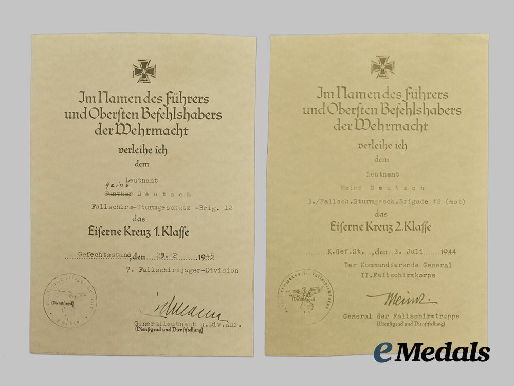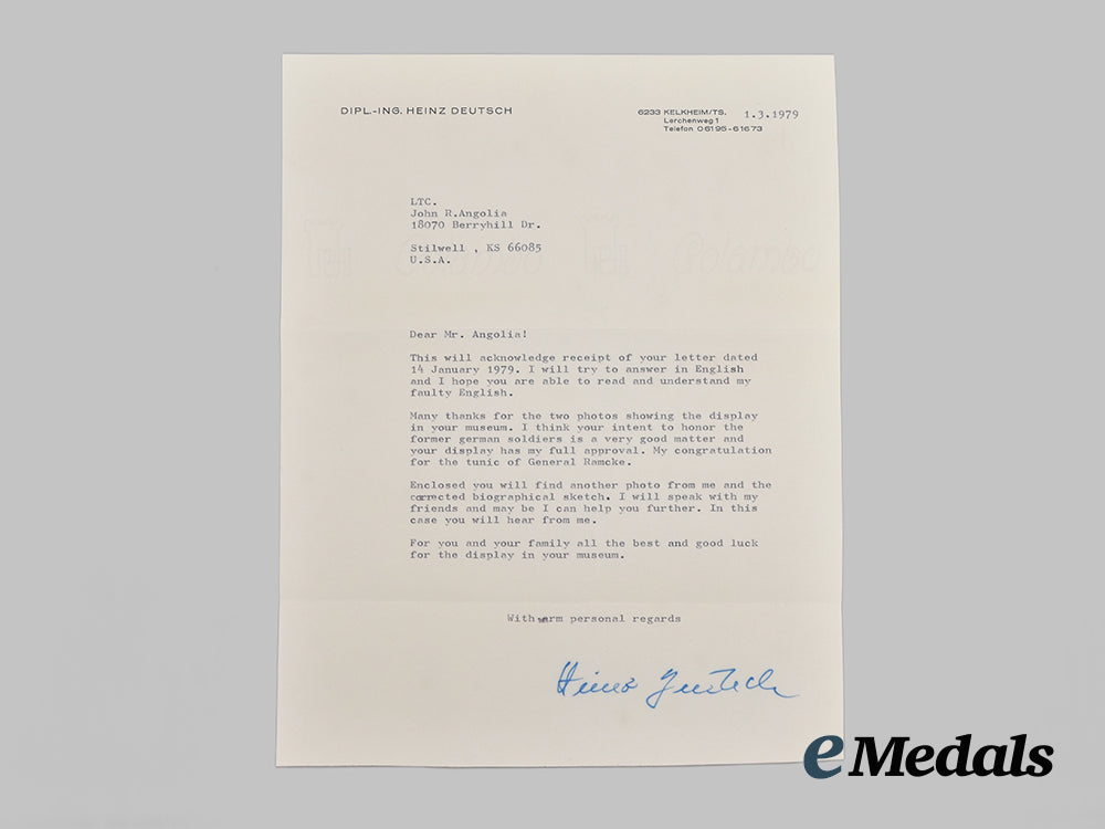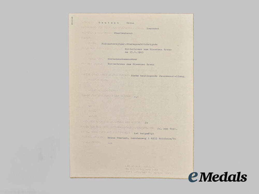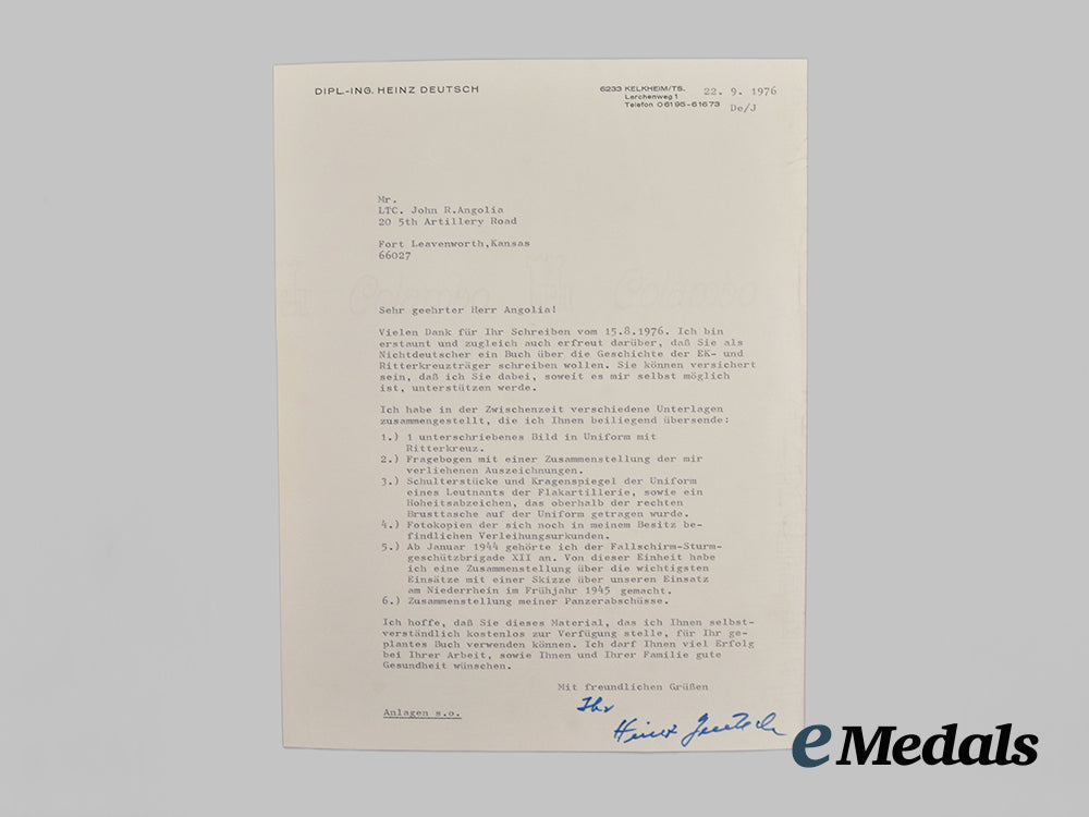 (Luftwaffe Ritterkreuzträger Briefe und Papiere). A lot paper items forwarded by Luftwaffe Knight’s Cross recipient Leutnant Heinz Deutsch, including a typewritten German-language letter to noted militaria reference guide author John R. Angolia, responding to an earlier inquiry from Angolia and enclosing a typewritten service history of Fallschirm-Sturmgeschütz-Brigade XII with a map of operational area (both included in this lot), dated 22 September 1976 and closing with Deutsch’s handwritten signature, also accompanied byEnglish-language letter to Angolia, approving of Angolia’s private museum displays and mentioning an accompanying typewritten biographical sketch, also accompanied by, the initial letter dated 1 March 1979, accompanied by facsimiles of Deutsch’s award documents for the 1939 Iron Cross in both II and I Classes, the Black Grade Wound Badge, and the Luftwaffe Fallschirmjäger Badge, a fascinating example of correspondence between a Knight’s Cross recipient and militaria pioneer in extremely fine condition.