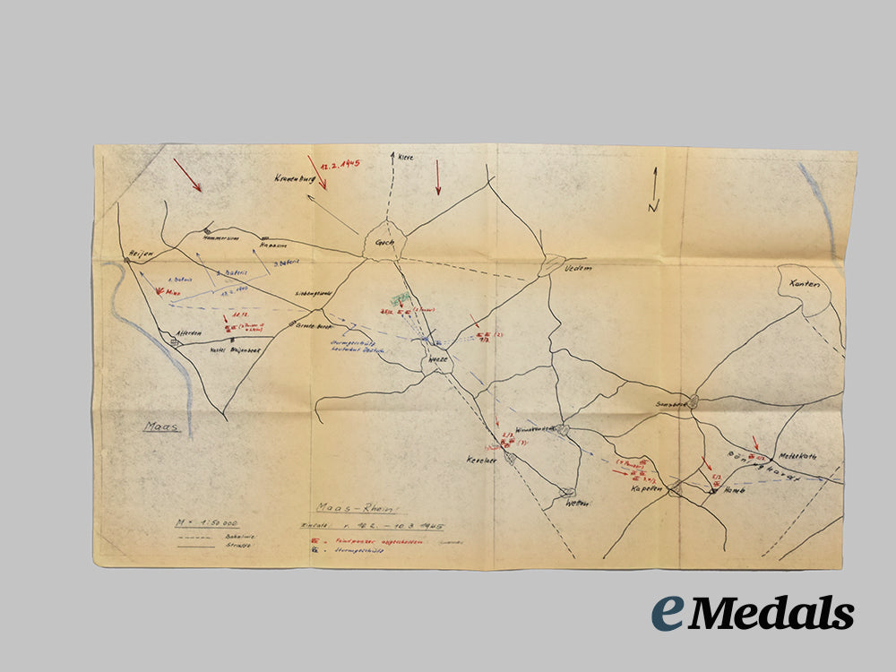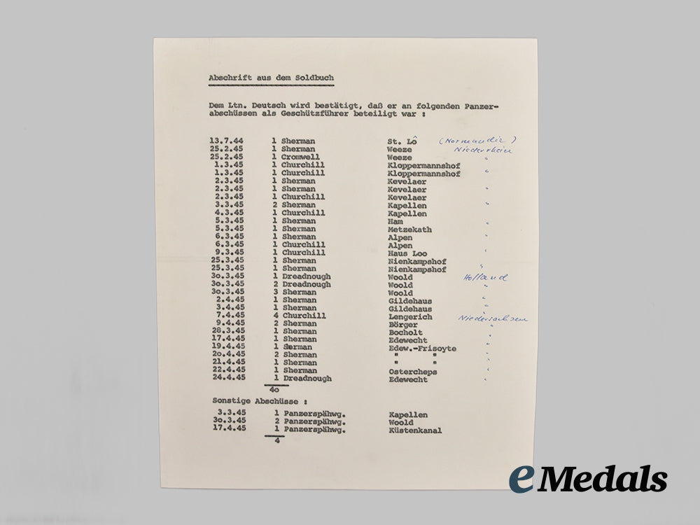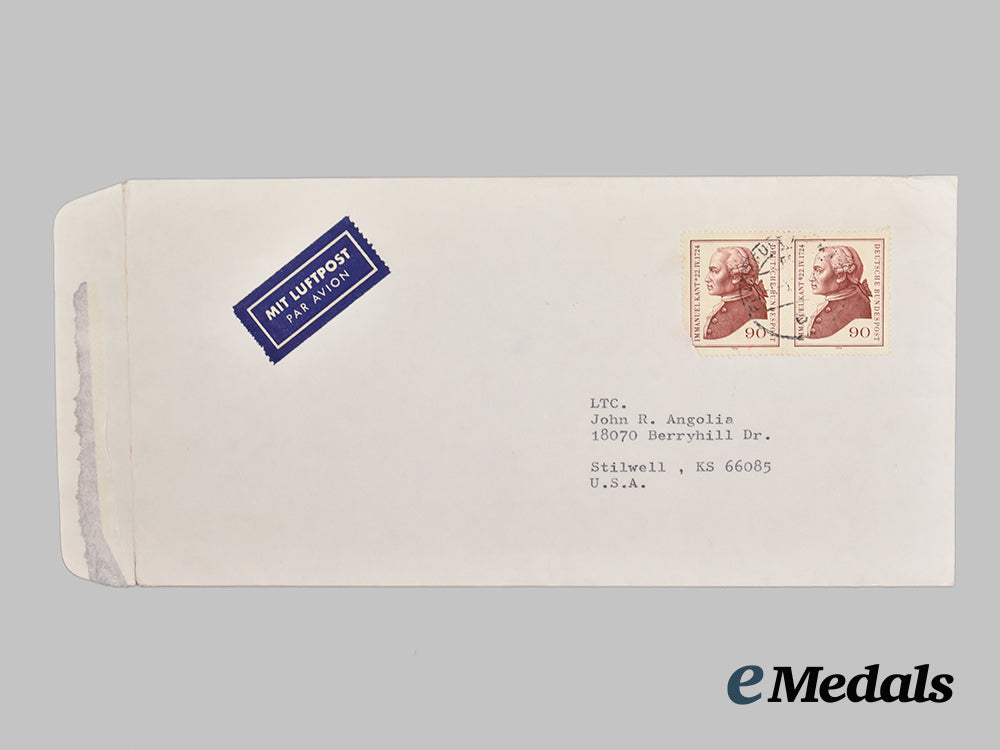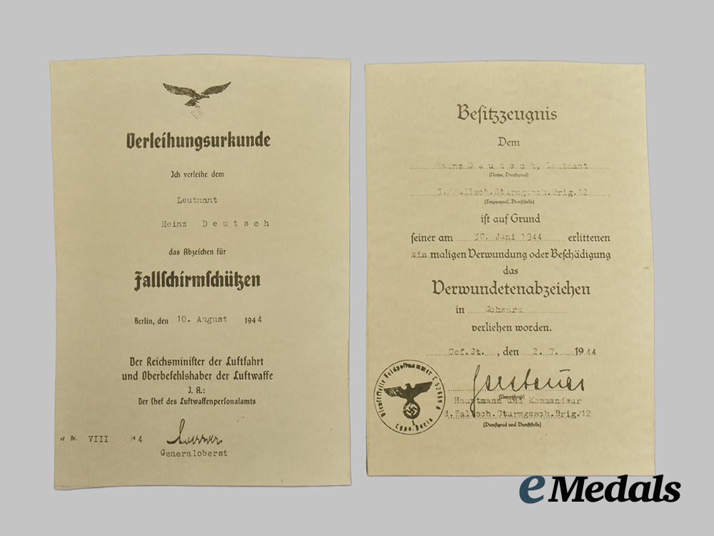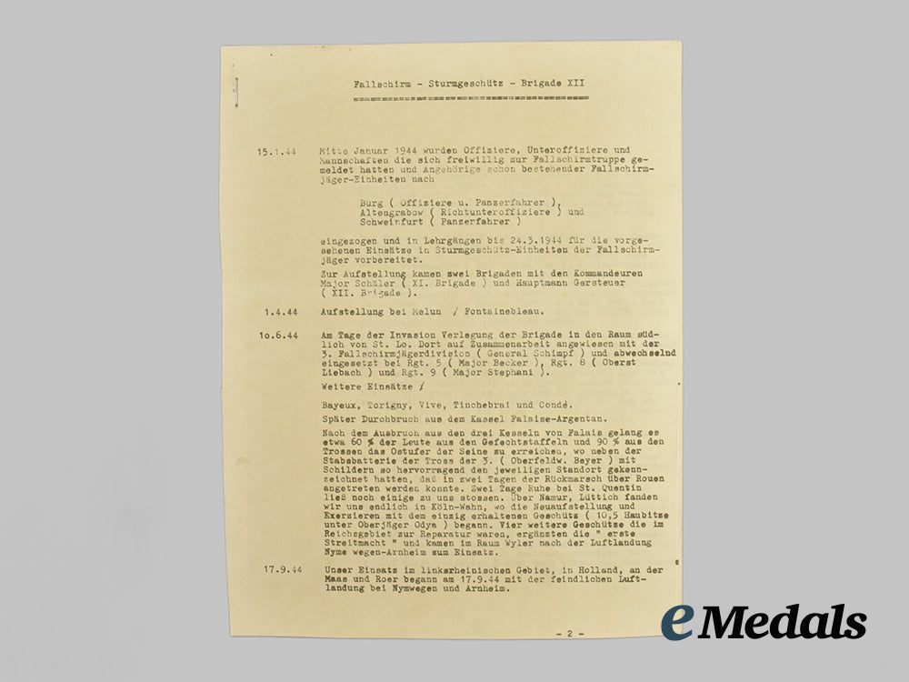 (Luftwaffe Ritterkreuzträger Briefe und Papiere). A lot paper items forwarded by Luftwaffe Knight’s Cross recipient Leutnant Heinz Deutsch, including a typewritten German-language letter to noted militaria reference guide author John R. Angolia, responding to an earlier inquiry from Angolia and enclosing a typewritten service history of Fallschirm-Sturmgeschütz-Brigade XII with a map of operational area (both included in this lot), dated 22 September 1976 and closing with Deutsch’s handwritten signature, also accompanied byEnglish-language letter to Angolia, approving of Angolia’s private museum displays and mentioning an accompanying typewritten biographical sketch, also accompanied by, the initial letter dated 1 March 1979, accompanied by facsimiles of Deutsch’s award documents for the 1939 Iron Cross in both II and I Classes, the Black Grade Wound Badge, and the Luftwaffe Fallschirmjäger Badge, a fascinating example of correspondence between a Knight’s Cross recipient and militaria pioneer in extremely fine condition.