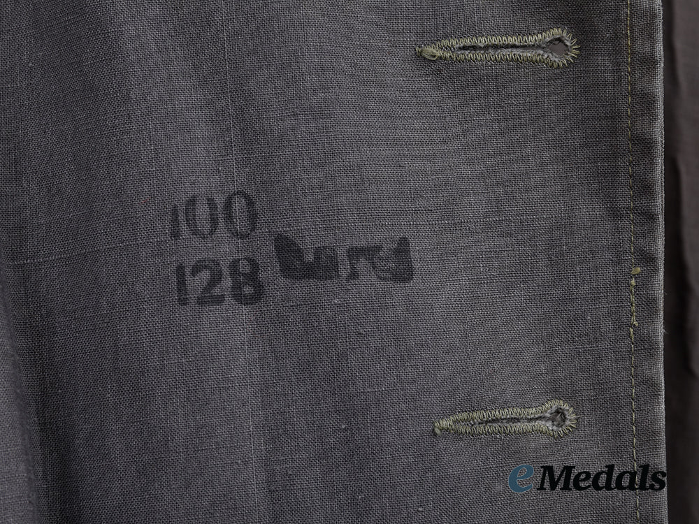(Ein Luftwaffe Oberleutnant Mantel). An example of a Luftwaffe greatcoat belonging to an Oberleutnant, constructed of weather hardened cotton rayon blend fabric, with a traditional turned-down collar and big lapels. On the underside of the collar, by the opening, is a hidden strip of fabric that meets a grey bakelite button on the opposing side to secure the collar shut during adverse weather conditions. The shoulders are decorated with sewn-on shoulder boards, buttoned to the tunic via one pebbled nonmagnetic button each. The shoulder boards have a cardstock core, covered with bright red wool and ordained on the top with two rows parallel running piping, constructed of rolled silver aluminum bullion wire, and then decorated further with one rank pip per board - denoting the rank of Oberleutnant, measuring 38 mm (w) x 115 mm (l). On the left lapel flap, vertically oriented, are six matching nonmagnetic buttons that are met by an equal number of reinforced buttonholes on the opposing side. On each side, at waist height, is a diagonal-slit pocket, secured shut via a straight-cut flap. The interior is unlined with the exception of the back-piece, which features an integrated air vent. It is marked with a tailor's label, reading “harei - DER WETTERMANN” in the interior of the coat on the outside of the right pocket fabric, as well as “100, 128” on the inside lapel. There is a 64 cm long vertical slit on the reverse of this coat, secured shut via three bakelite buttons. It measures approximately 67 cm across the shoulders (seam to seam), and with a sleeve length of 62 cm. This coat demonstrates age-appropriate, including grease splashes around the cuffs and the rear of the collar, in overall near very fine condition.
