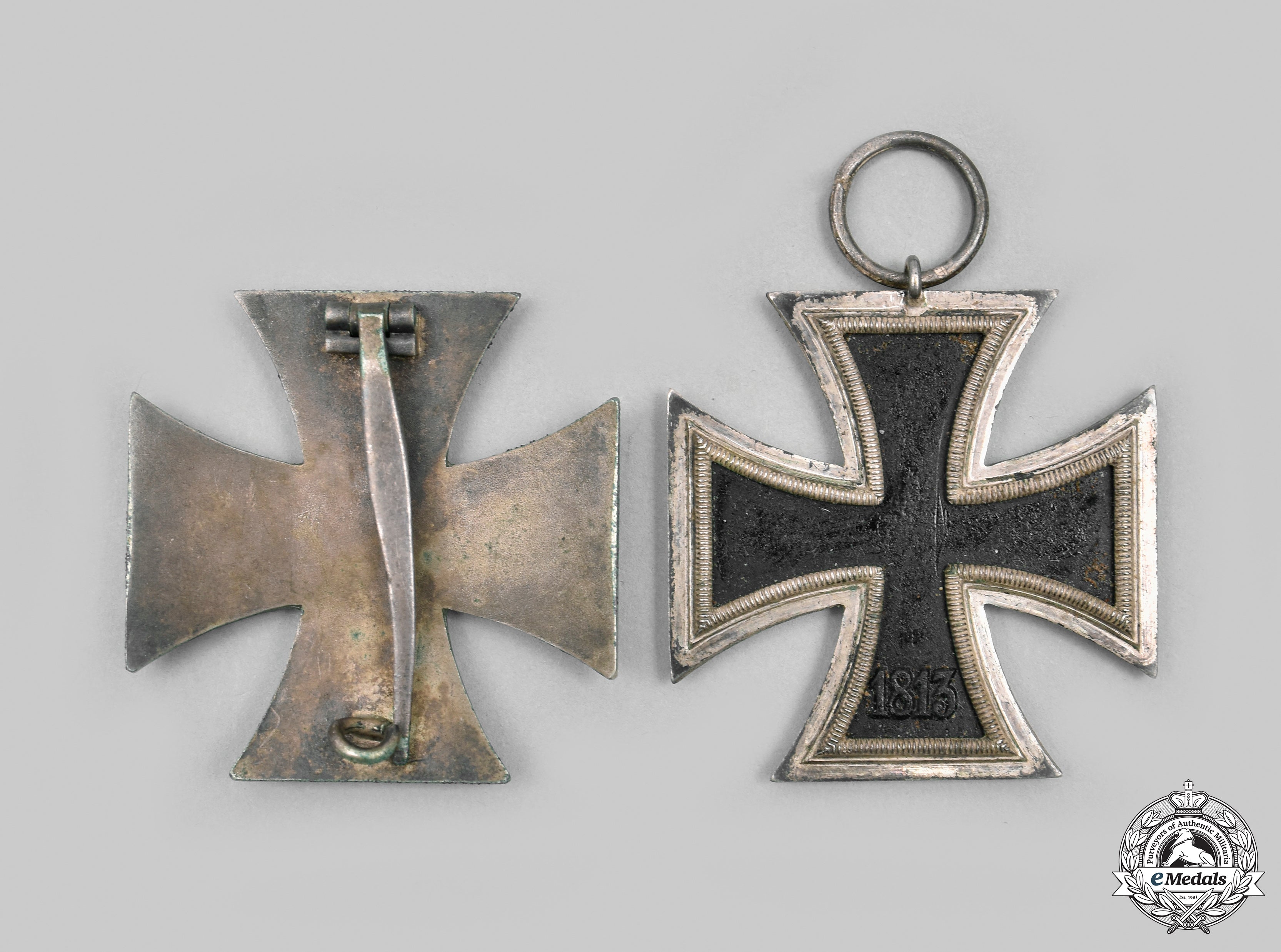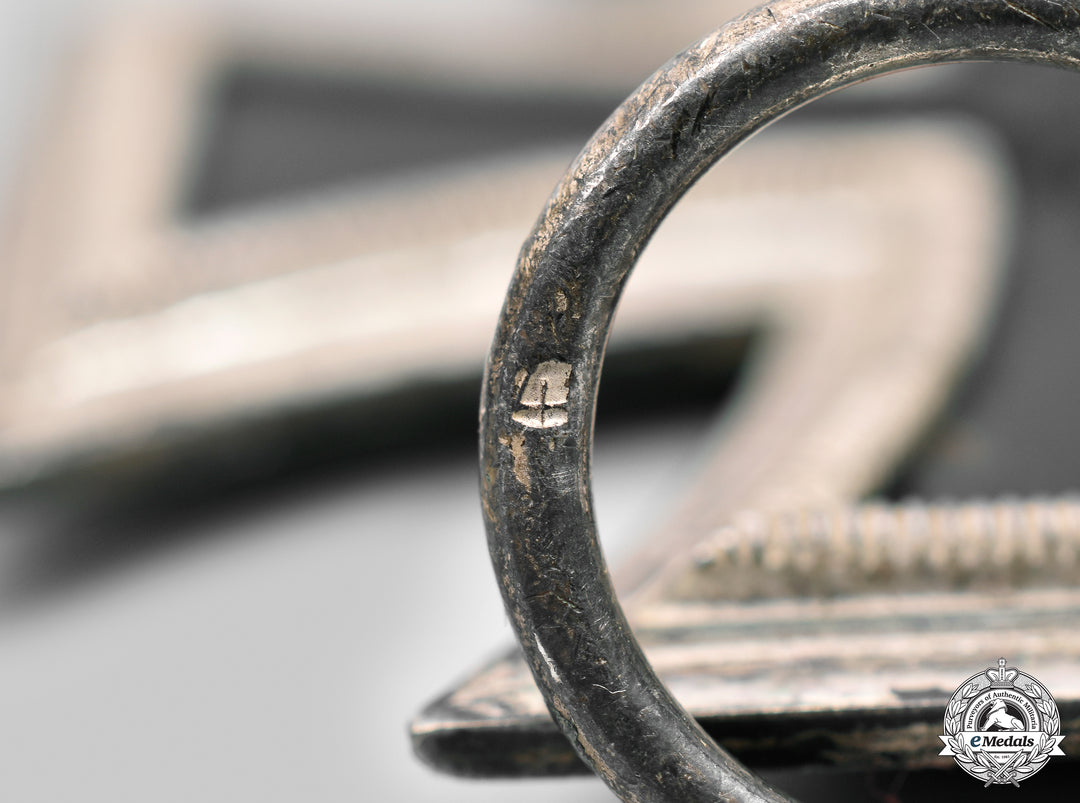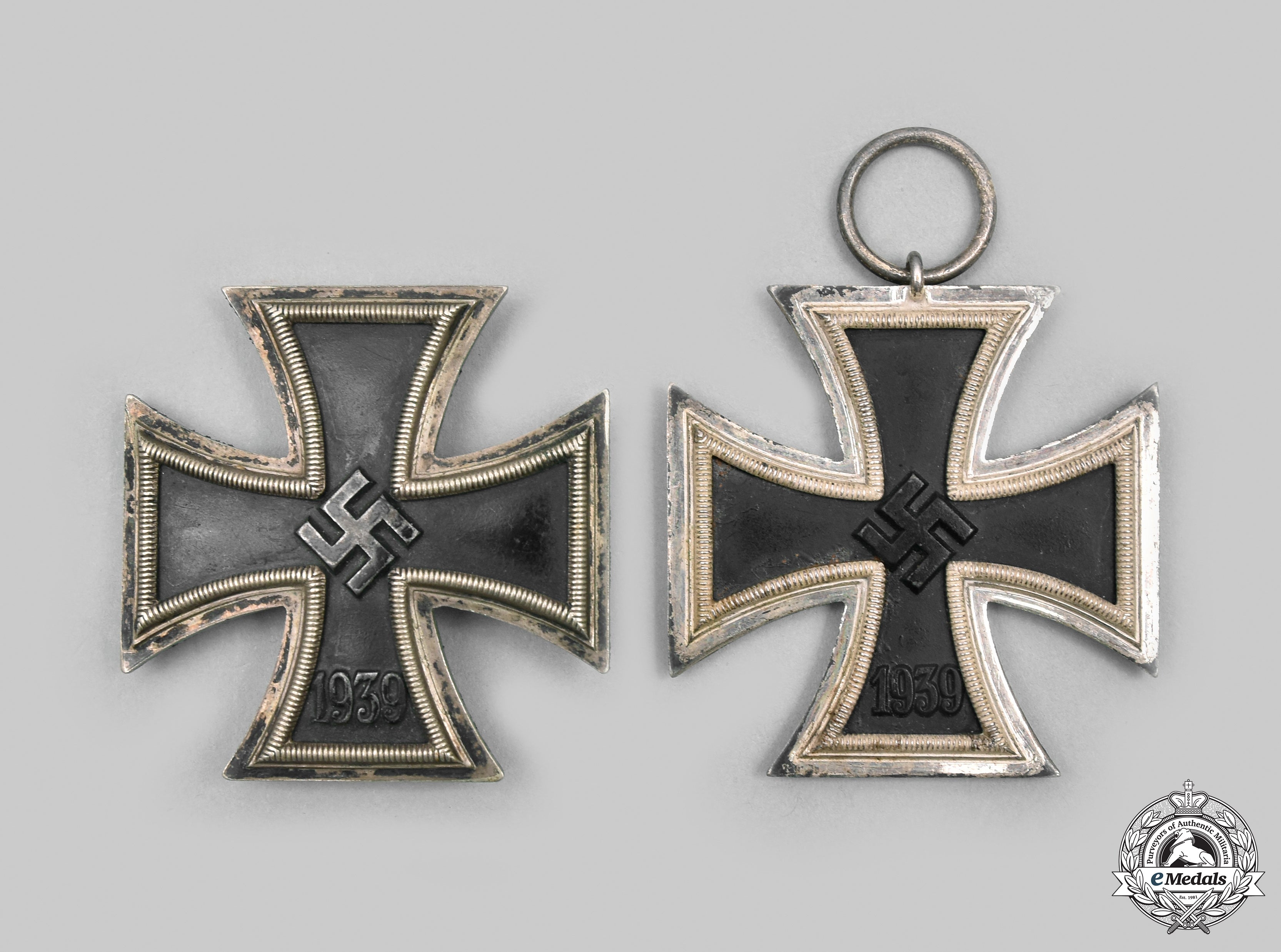 1. A 1939 Iron Cross II Class, constructed of iron and silver, on loop for suspension from its period original ribbon, consisting of a Cross Pattée with a blackened magnetic iron core within a ribbed silver frame, the obverse with a central mobile swastika, the six o’clock arm with a reinstitution date of “1939”, the reverse six o’clock arm with an initial institution date of “1813”, the suspension loop maker marked with Präsidialkanzlei code “4” for Steinhauer & Lück, Lüdenscheid, measuring 44.43 mm (w) x 47.40 mm (h), weighing 18.9 grams, with some oxidation evident to the core, in near extremely fine condition; accompanied by its award document, named to Brill as an Oberfeldwebel of Jagdgeschwader 54, issued on 21 March 1943, featuring a handwritten signature of an unidentified Oberst and stand-in commander, measuring 142 mm (w) 198 mm (h), affixed to a card stock backer and with tearing and creasing evident to the document, in poor condition.
