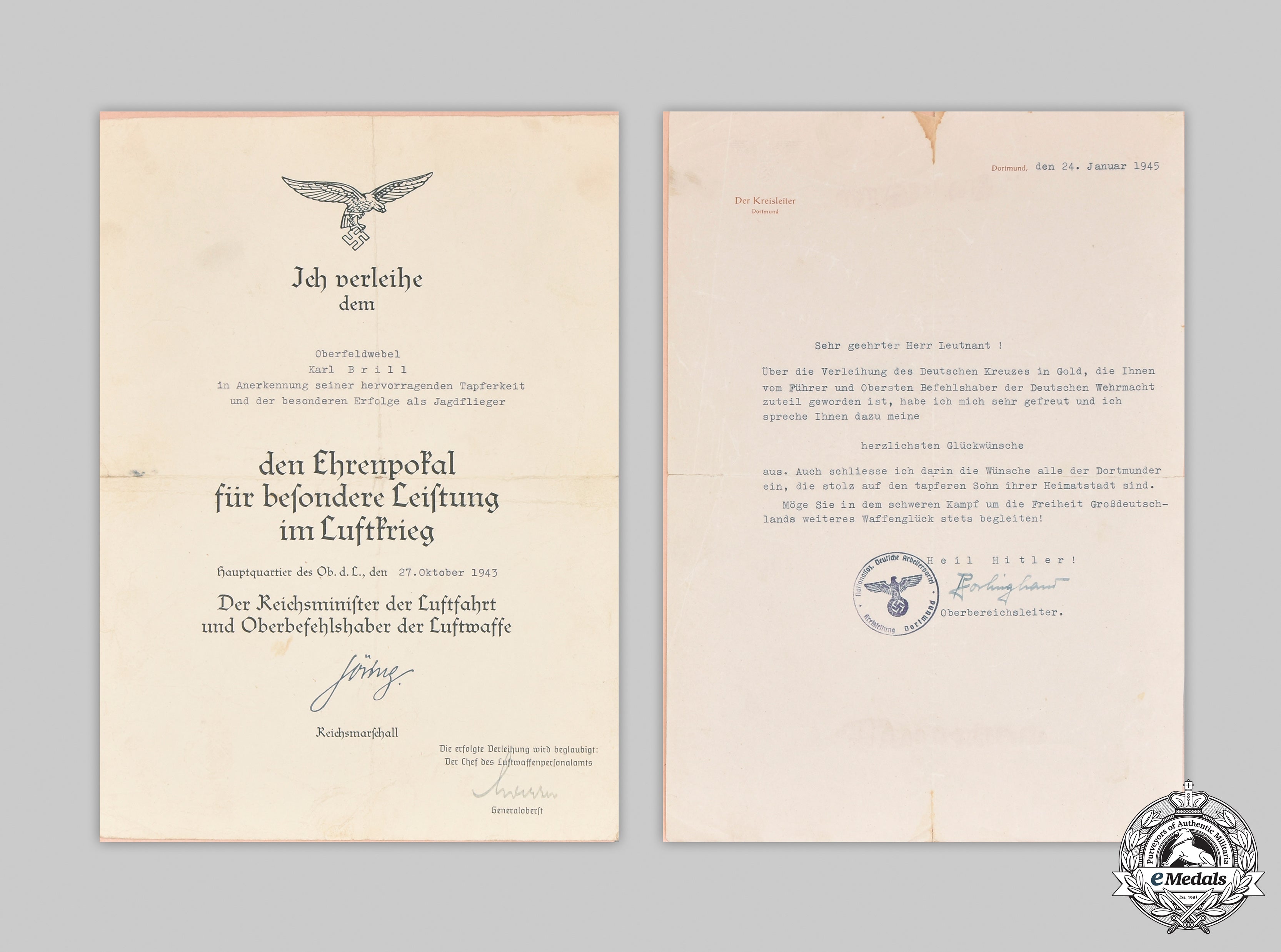 9. An award document for a Luftwaffe Honour Goblet, named to Brill as an Oberfeldwebel in recognition of bravery and exceptional achievements as a fighter pilot, issued on 27 October 1943, featuring a facsimile signature of Reichsmarschall Hermann Göring and a handwritten signature of Generaloberst Bruno Loerzer (Pour le Mérite, 12 February 1918; Knight’s Cross of the Iron Cross, 29 May 1940), measuring 210 mm (w) x 293 mm (h), affixed to a card stock backer and with creasing and some tears evident, in very fine condition.