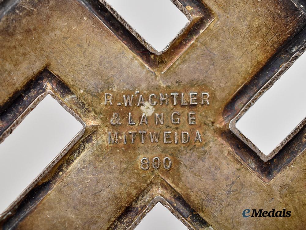 (Gau-Abzeichen für Mitglieder der NSDAP seit 1925). Constructed of silver with enamels, the obverse consisting of a mobile swastika with black enameled arms, bearing a central silvered date of “1925”, the reverse with two lugs formerly connecting to a wreath with pinback, maker marked “WÄCHTLER & LANGE, MITTWEIDA”, with a silver content number of “800”, measuring 45.64 mm (w) x 45.86 mm (h), weighing 11.2 grams, demonstrating cracking and chipping to the enamels in addition to the loss of the base wreath, in fair condition.