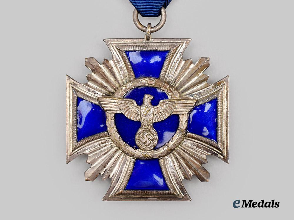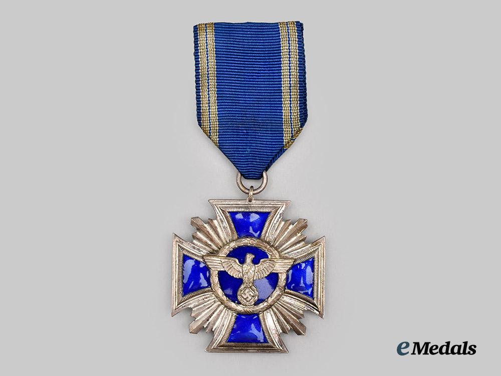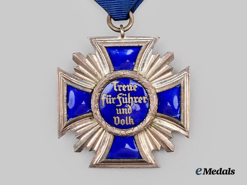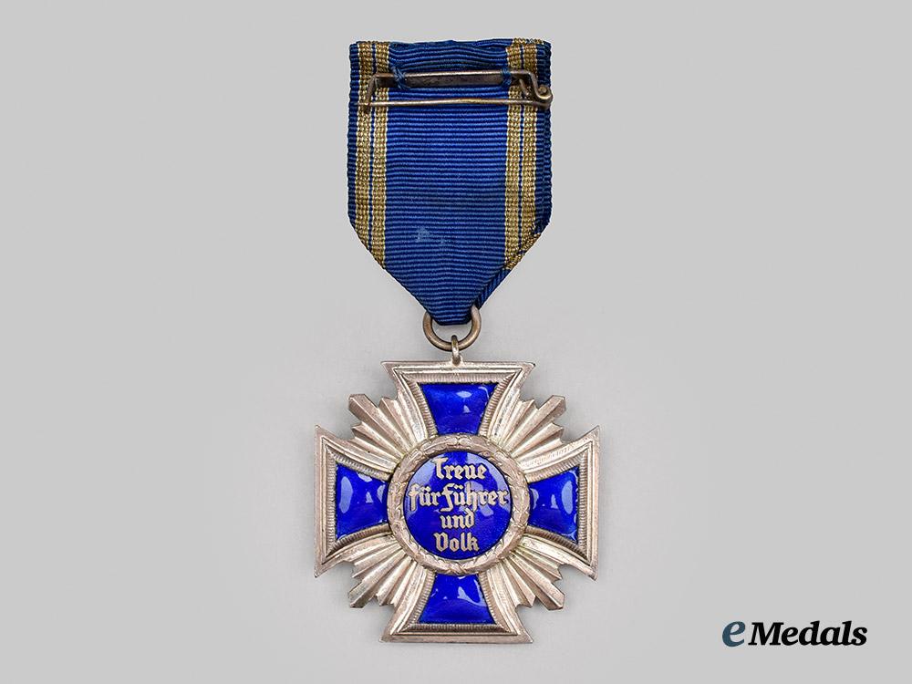 (Dienstauszeichnung der NSDAP, II. Klasse für 15 Jahre). Instituted 2 April 1939. (1939-1945 issue). Constructed of silvered bronze with enamels, on loop for suspension from its period original ribbon with horizontal pinback, consisting of a Cross Pattée with ribbed and blue enameled arms joined through the quadrants by stylized rays, the obverse bearing a central blue enameled medallion surrounded by a circular oak leaf wreath overlaid by an NSDAP-style German national eagle clutching a wreathed mobile swastika, the reverse bearing a central blue enameled medallion, situated within a circular oak leaf wreath and overlaid by a silvered inscription of “TREUE FÜR FÜHRER UND VOLK” (“LOYALTY FOR FÜHRER AND PEOPLE”), unmarked, measuring 42.68 mm (w) x 46.48 mm (h), weighing 41.6 grams (inclusive of ribbon), in extremely fine condition.
