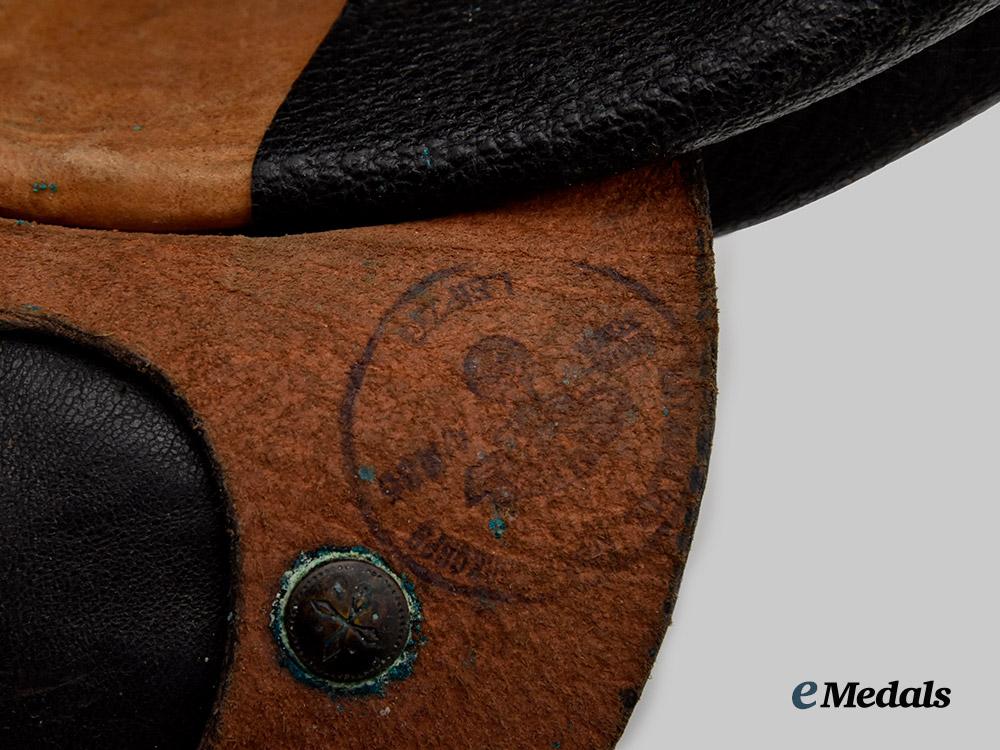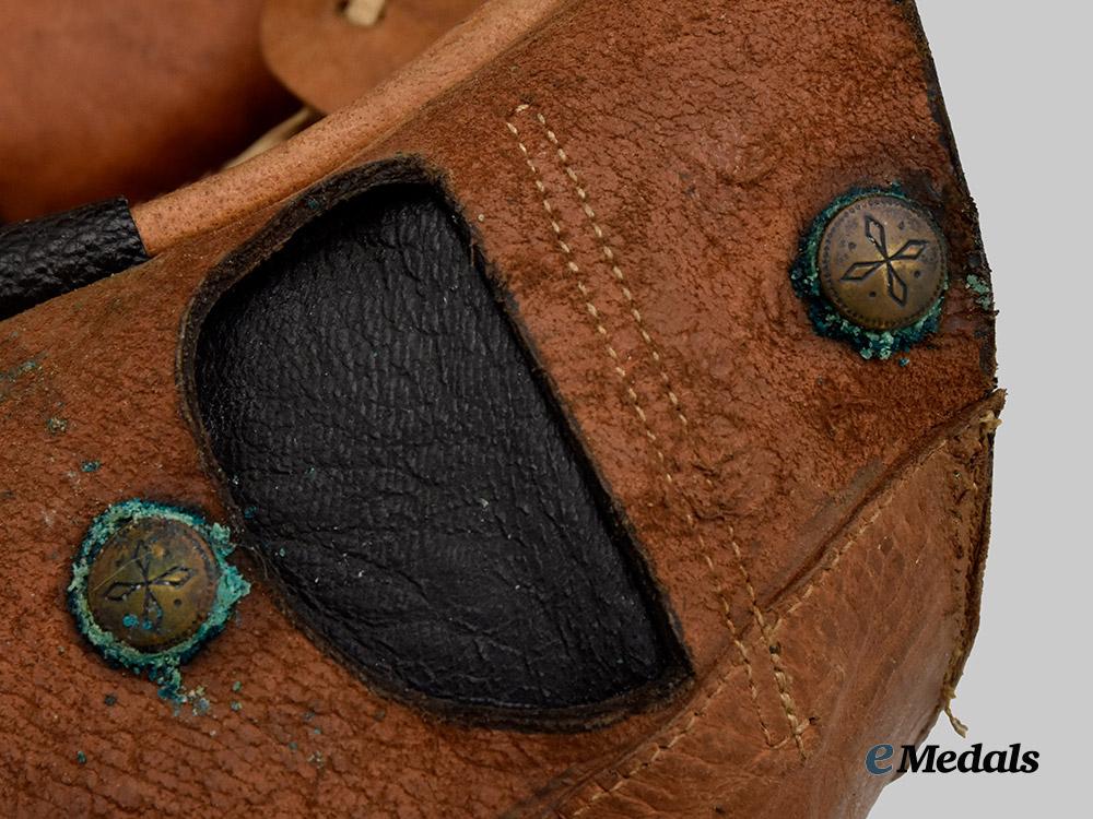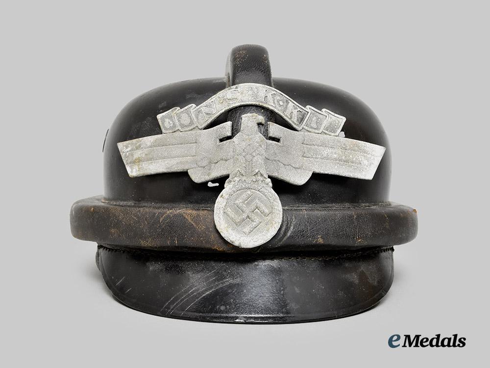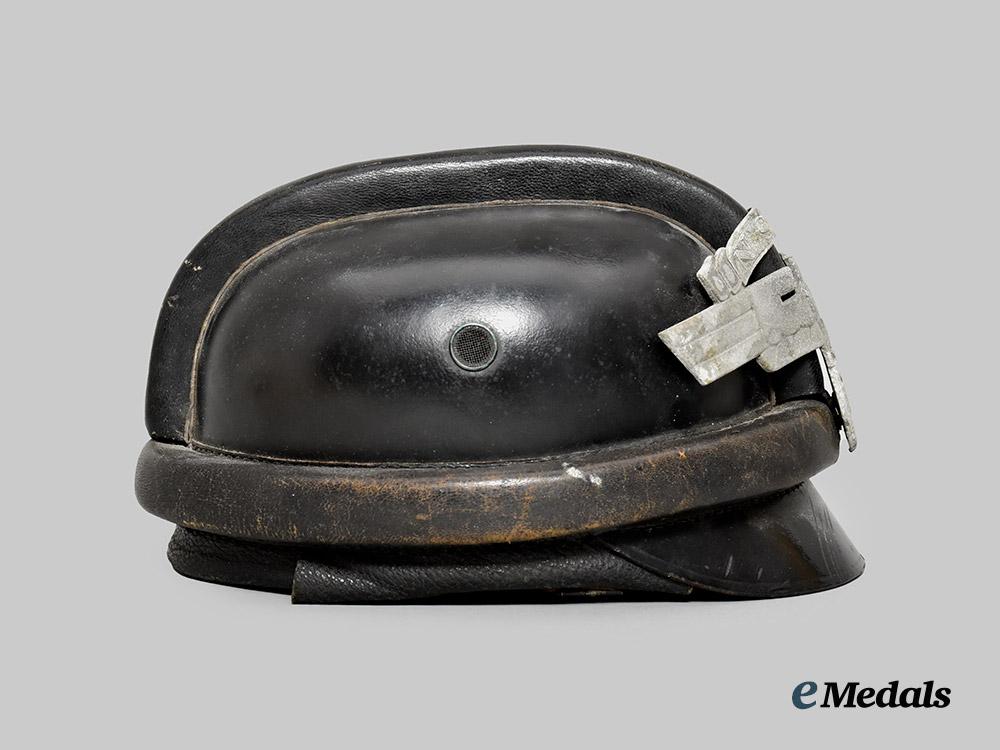 (Nationalsozialistisches Kraftfahrkorps Motorrad Sturzhelm). A well-preserved Nationalsozialistisches Kraftfahrkorps (National Socialist Motor Corps/NSKK) crash helmet, constructed of boiled and blackened leather shell. The helmet features a padded black leather comb extending across the crown, with an additional tube of identical construction surrounding the rim. It is flanked on each side by a ventilation hole reinforced with non-magnetic metal mesh. Riveted to the peak is a second pattern NSKK-style German national eagle clutching a wreathed mobile swastika, constructed of blackened and silvered bronze and measuring 16.5 mm (w) x 9 cm (h) as presented. The exterior features are completed with a narrow, sloping visor similarly constructed of blackened leather. Descending from the interior rim is a blackened leather neck guard featuring hidden earpieces for functionality during wear. When not in use, the flap neatly rolls up and secures in place. Also descending from the rim are blackened leather ear guards complete with flaps which fasten in place with bronze studs. The interior is encompassed by a brown leather liner which culminates in nine fingers, each perforated at the top with eyelets through which is looped and original drawstring. Emanating from the crown is a padded brown leather guard. Stamped onto the reverse of the left ear guard is a partially-legible NSKK unit mark which appears to be attributed to Motorgruppe Leipzig. Also stamped onto the liner is a size mark of “58”. The helmet measures approximately 21 cm (w) x 26 cm (l) x 16 cm (h) (inclusive of visor and comb). Minor, age-appropriate material fatigue is evident to the helmet, while the peak insignia demonstrates extensive oxidation and loss of finish consistent with storage conditions. The helmet remains in an overall better than very fine condition.