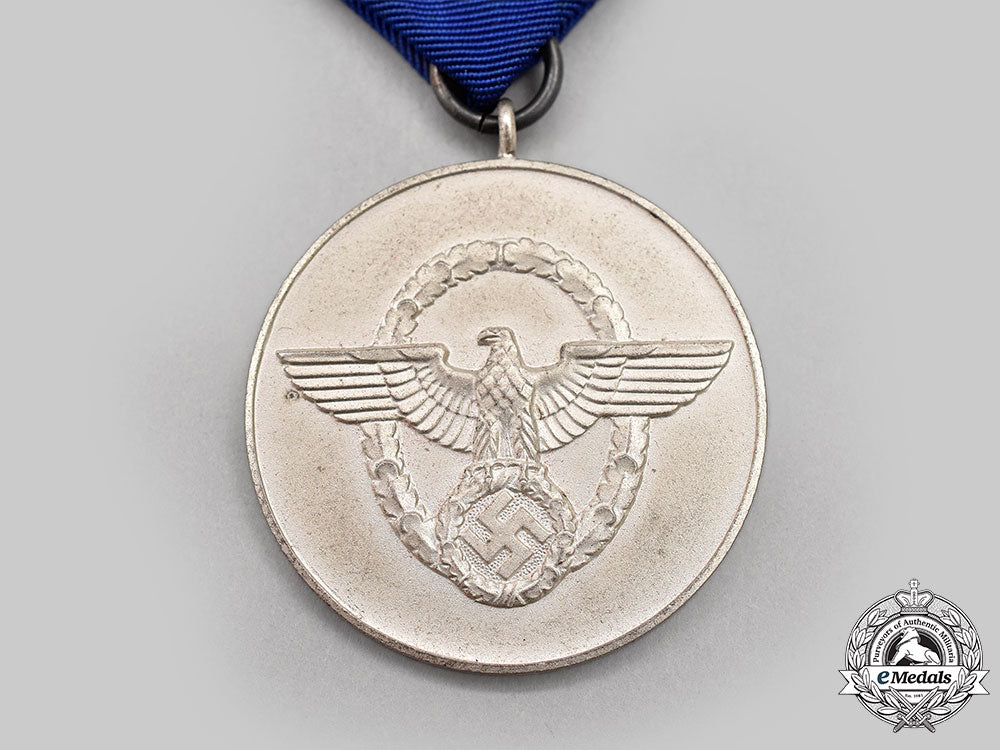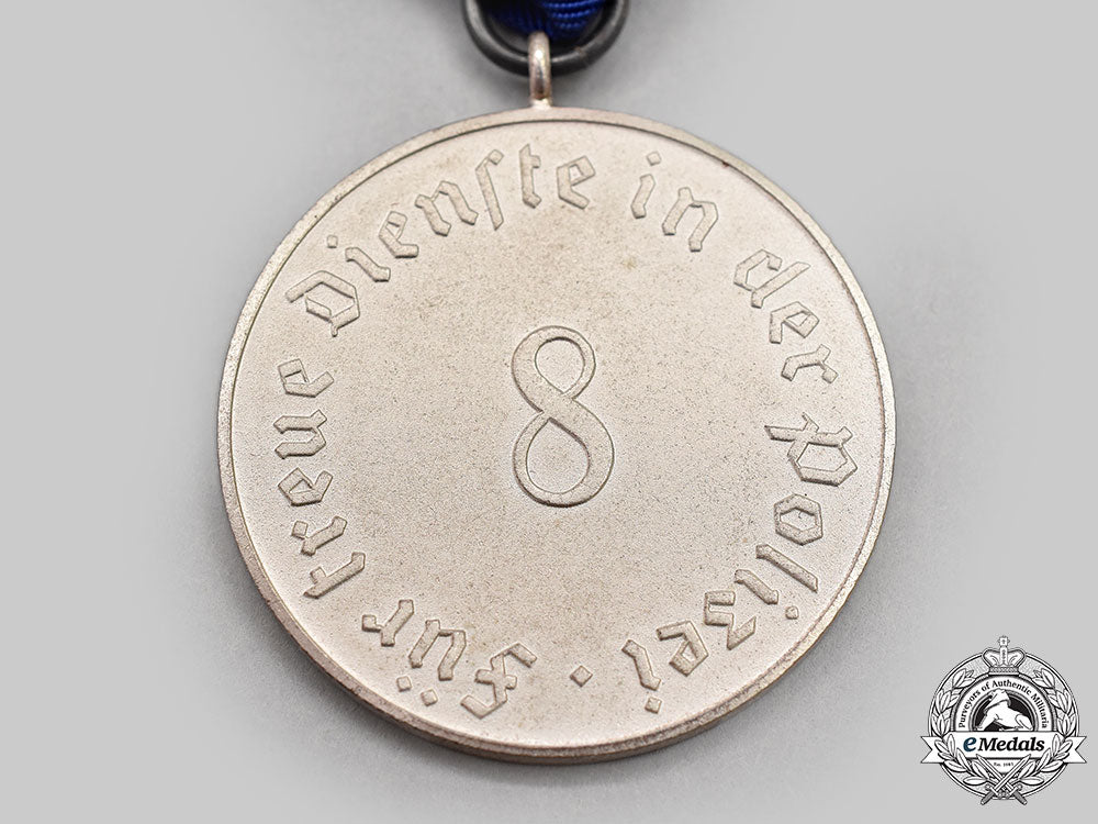1. A Long Service Decoration, III Class for 8 Years, constructed of silvered bronze, on loop for suspension from its period original ribbon with horizontal pinback, the obverse bearing a raised Ordnungspolizei insignia in the form of an oval oak leaf wreath overlaid by a German nationale eagle clutching a wreathed mobile swastika, the reverse bearing a central number “8” circumscribed by an inscription of “FÜR TREUE DIENSTE IN DER POLIZEI” (“FOR FAITHFUL SERVICE IN THE POLICE”), unmarked, measuring 38.10 mm in diameter, weighing 23.3 grams (inclusive of ribbon), in near mint condition, accompanied by its period original presentation case, constructed of a two-piece card stock frame with a faux dark green leather liner, the lid bearing a silvered number “8” within a cogwheel, unmarked, measuring 48 mm (w) x 100 mm (l), in extremely fine condition.