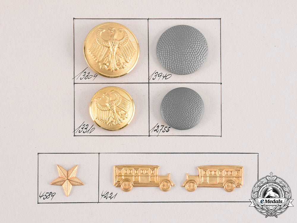 Reichspost: Two gilt buttons with raised eagle; grey Postschutz (postal security) button; gilt star cypher; two gilt bus cyphers.