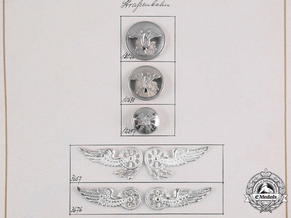 Straßenbahn: Three silvered buttons with raised winged wheel; four silvered winged wheel collar cyphers, two with lightning bolts and two without.