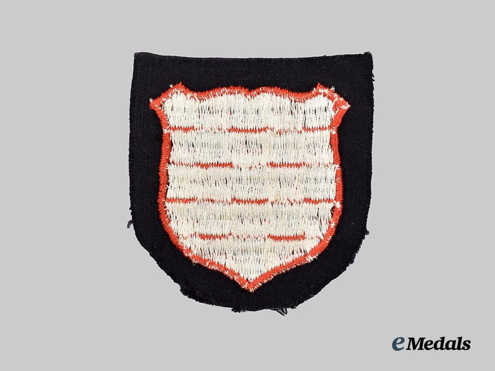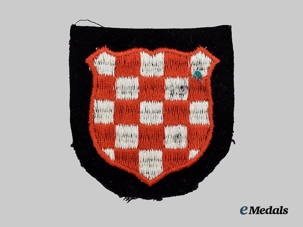 (Ärmelschild der Kroatischen Freiwilligen der Waffen-SS Division Handschar). Constructed of black wool, the obverse bearing a machine-embroidered red and white Croatian national emblem, unmarked, measuring 60 mm (w) x 60 mm (h), demonstrating minor soiling to the obverse, in unissued and extremely fine condition.