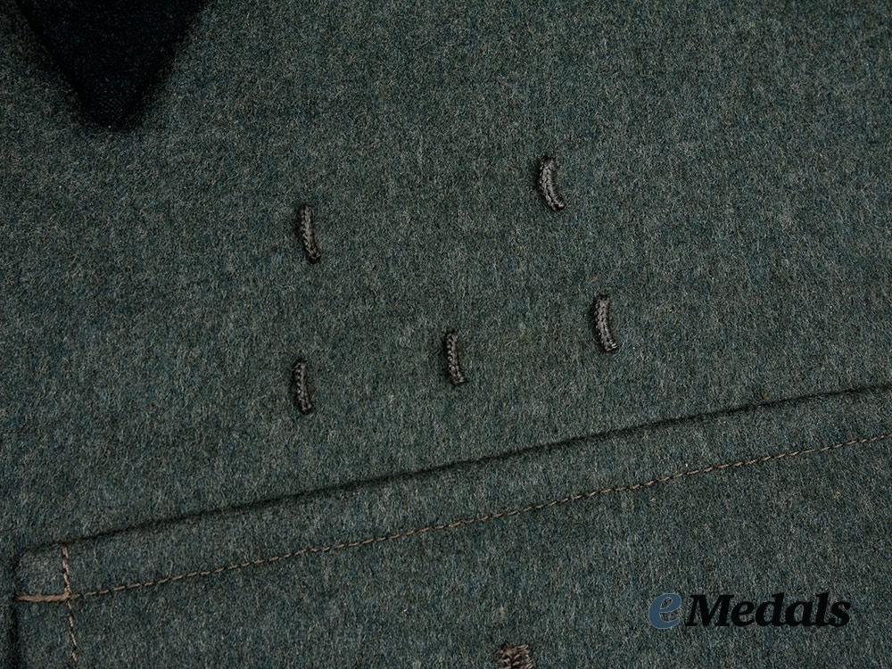 (Waffen-SS Waffenrock für Brigadeführer). A rare and exceptional service tunic belonging to SS-Brigadeführer Sylvester Stadler, a career Waffen-SS Officer who rose to become commander of the 9th SS Panzer Division Hohenstaufen. It is constructed of a fine quality field-grey wool and features a turned-down collar fully lined on the obverse with smooth dark green wool. The collar is flanked by matching collar tabs constructed of black doeskin, trimmed with twisted and rolled silver aluminum wire piping, and bearing three silver aluminum wire oak leaves in the pattern used from 1942 until the end of the war. Each tab measures 45 mm (w) x 60 mm (l) overall. The shoulders are flanked by matching boards constructed of grey wool with card stock cores reinforced with magnetic metal wire reinforcements. The boards are topped by a single band of silver aluminum wire piping interwoven with dual bands of gold bullion wire piping. Each measuring 45 mm (w) x 110 mm (l), the boards are secured in place with machine stitching at the outer edge and with pebbled buttons on the inner edge. Stitched onto the upper left shoulder is an insignia consisting of a black wool backer bearing a carefully hand-embroidered silver aluminum wire SS-style German national eagle clutching a wreathed mobile swastika, measuring 90 mm (w) x 40 mm (h). The cuff of each sleeve is rolled up to a depth of 15 cm and secured in place with two pieces of heavy machine stitching. Each breast flap has two pleated pockets, all closing with scalloped flaps perforated with reinforced buttonholes, in turn meeting pebbled magnetic metal buttons. The upper left pocket is overlaid by three sets of vertically-arranged threaded loops for the accommodation of decorations with a horizontal pinback, while the same pocket is topped by two sets of horizontally-arranged loops, with one set permitting attachment of Stadler’s Close Combat Clasp. The tunic closes with six pebbled magnetic metal buttons on the left flap meeting an equal number of reinforced buttonholes on the left flap. The interior is fully encompassed by a multi-piece rayon liner, with the torse presenting in a slate-grey, in turn transitioning to a dark pinstripe design through the arms. Pockets opening with reinforced horizontal flaps are set into both of the upper breasts. An additional reinforced slit on the left side accommodates the attachment of a dagger. Three butterfly clips set into the interior of the collar allow for the inclusion of a stay, while the upper edge of the collar features a white cotton sweat guard. The tunic is fully unmarked, and measures approximately 44 cm across the shoulders, with an arm length of 59 cm, and an overall body length of 68 cm when folded on a flat surface. Demonstrating only minor signs of age and wear to the material, this rare tunic, never before offered in the collector market, is in an extremely fine condition.
