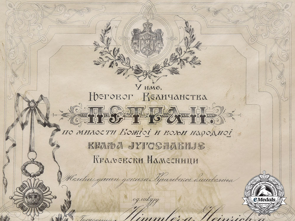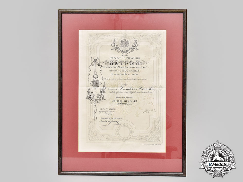 Germany, Ss. A Rare Award Document For An Order Of The Yugoslav Crown, I Class, To Reichsführer-Ss Heinrich Himmler