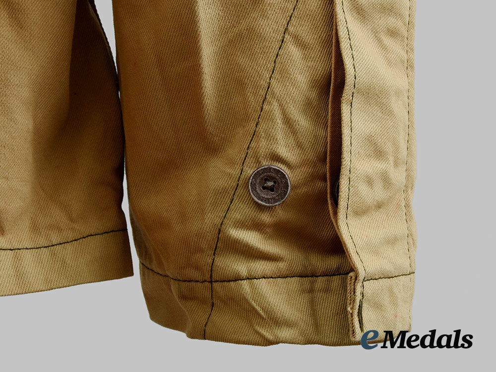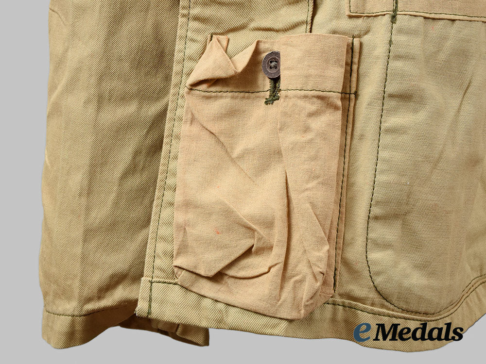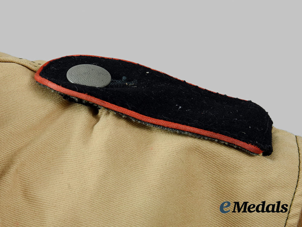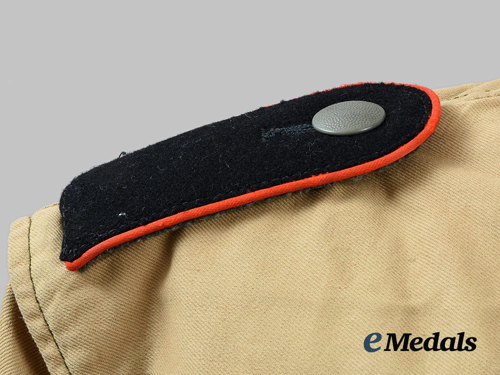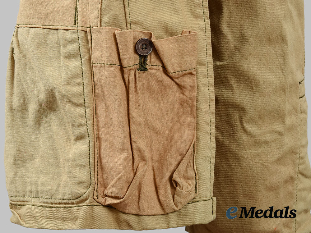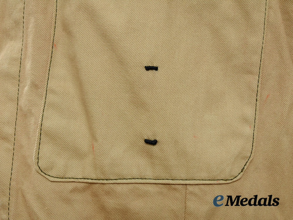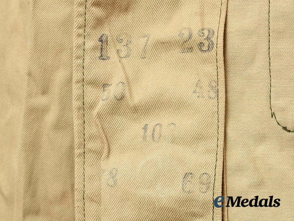 (Tropenbluse für einen Waffen-SS Rottenführer). A well preserved service tunic, constructed of tan-coloured cotton twill and featuring a turned-down collar. Secured to the shoulders is a set of slip-on shoulder straps that are attached to the uniform via an internal fabric channel as well as a magnetic pebbled button. The shoulder straps are constructed of black wool and trimmed with red piping, while the reverse of the straps are constructed of field-grey wool, with the tongues manufactured out of black rayon material, measuring 45mm (w) x 108 mm (l). Visible on the right sleeve near the shoulders is a faint outline of where the Waffen-SS tropical eagle used to be, with tropical Waffen-SS Rottenführer chevron directly underneath, constructed of a inverted triangular black wool backer with golden-tan coloured rayon diamond patterned tresse chevrons in a V-formation, measuring 85 mm (w) x 75 mm (l). This tunic features a total of four horizontal-slit pockets all secured by a scalloped flap and a pebbled bakelite button that is met with a reinforced buttonhole on the flap. Each button is dated “1942” and maker-marked “JFS'' on the reverse, and is attached to the tunic via a spiral metal loop on the inside of the tunic. The left breast pocket features 2 black loops for the attachment of awards with a vertical-pinback. The interior is completely unlined, with a loop for hanging on the collar and an internal channel along the waist for the addition of a drawstring that is missing. The interior of the tunic has two small pockets that are secured shut via a single pressed paper button, and is marked “137, 23, 50, 48, 108, 78, 69” on the inside of the right-hand lapel. It measures approximately 51 cm (seam to seam), with an arm length of 68 cm, and an approximate overall body length of 88 cm. This tunic is overall well preserved, showing age appropriate wear with minor fatigue and light soiling in the material, in overall very fine condition.