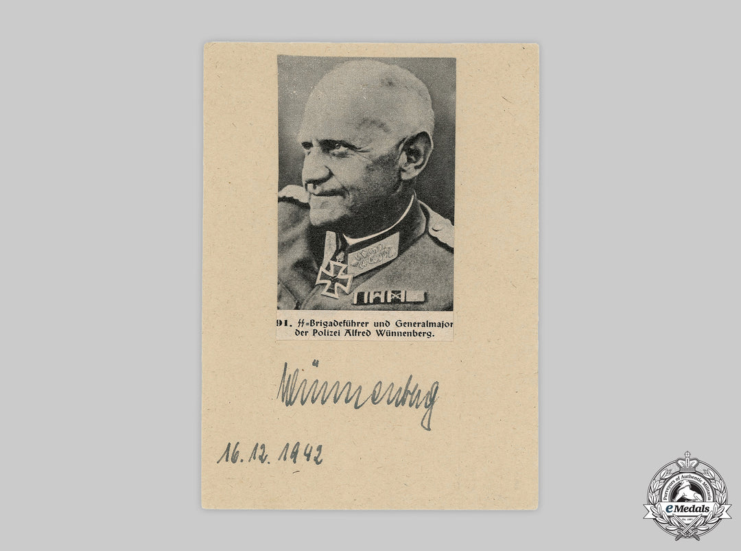 (SS Bild mit Unterschrift). A wartime signed photo of SS-Brigadeführer and Generalmajor der Polizei Alfred Wünnenberg, with an image and caption cut from a newspaper and pasted to a paper stock backer, the former bearing Wünnenberg’s handwritten signature in blue ink, above a date of “16. 12. 1942”, measuring 106 mm (w) x 148 mm (h), in extremely fine condition.