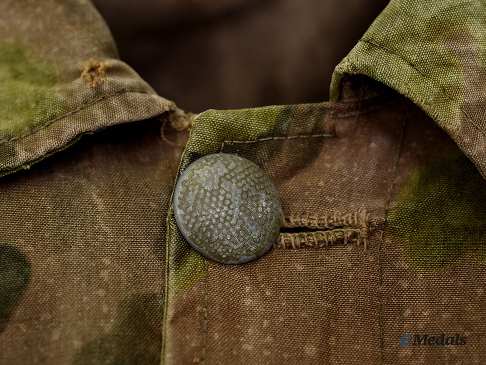 (Waffen-SS M44 Tarnjacke). A scarce Waffen-SS reversible camouflage drill jacket, constructed of a weatherproof cotton duck cloth. The exterior of the jacket is dyed in a classic Oak Leaf B pattern summer camouflage with a mottle consisting of a predominantly medium brown base overlaid by irregular shapes of light and dark green. The reverse is dyed in an analogous autumn pattern consisting of a medium brown base overlaid by irregular shapes of dark and light brown. It features a turned down collar, with the summer side featuring loops around the shoulders for the insertion of optional vegetation. The summer side also features dual side pockets, closing with vertical flaps. It closes with six pebbled buttons on the right flap (with five constructed of zink and one replacement button of magnetic metal) meeting an equal number of reinforced buttonholes on the left. Unmarked, the jacket measures approximately 50 cm across the shoulders, with an arm length of 54 cm, and an overall body length of 59 cm. The jacket demonstrates consistent material fatigue throughout, including hole and tears to the arms, and the removal of the autumn side features, possibly consistent with postwar use as outdoor or hunting gear. This experienced jacket remains in a very fine condition.