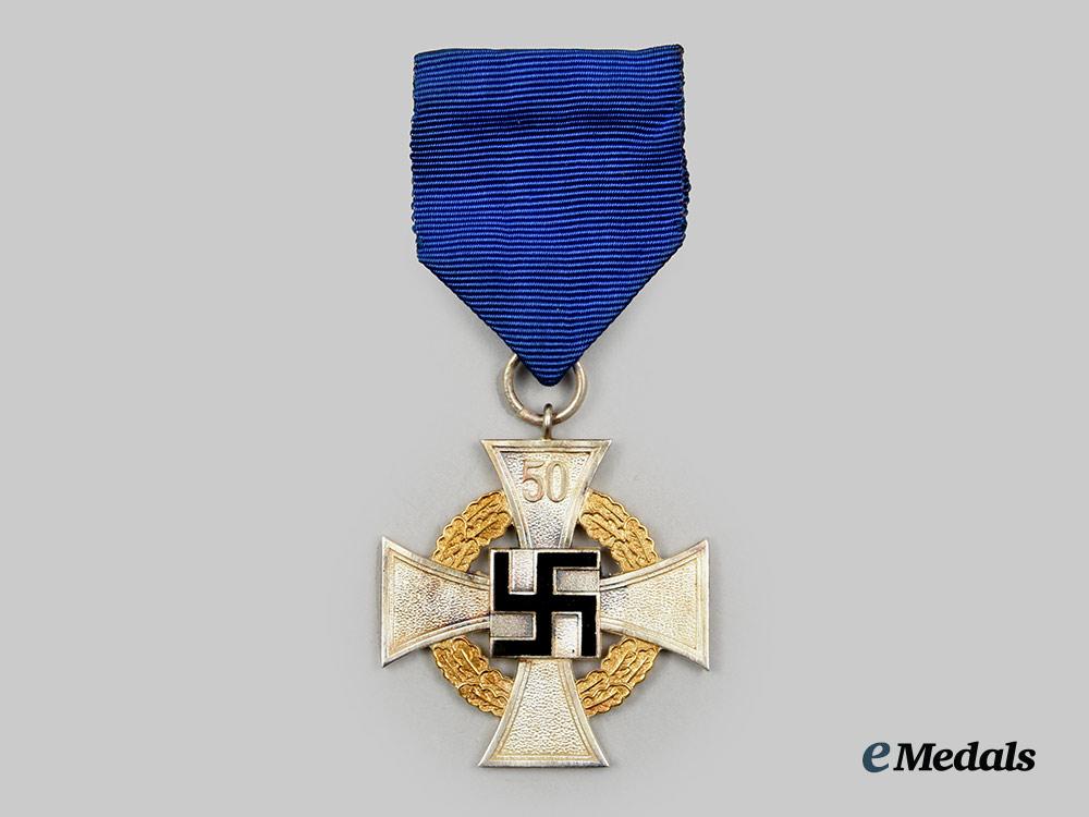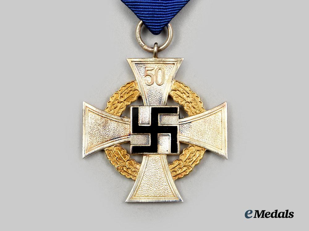 (Treuedienst-Ehrenzeichen Sonderstufe für 50 Jahre). Constructed of gilded and silvered bronze with enamels, on loop for suspension from its period original ribbon with horizontal pinback, consisting of a Cross Pattée with pebbled arms joined through the quadrants by a circular oak leaf wreath, the obverse bearing a central black enameled swastika, the twelve o’clock arm bearing a raised number “50”, the reverse bearing a central raised inscription of “FÜR TREUE DIENSTE” (“FOR FAITHFUL SERVICE”), unmarked, measuring 42.18 mm (w) x 46.77 mm (h), weighing 23.4 grams (inclusive of ribbon), in extremely fine condition.