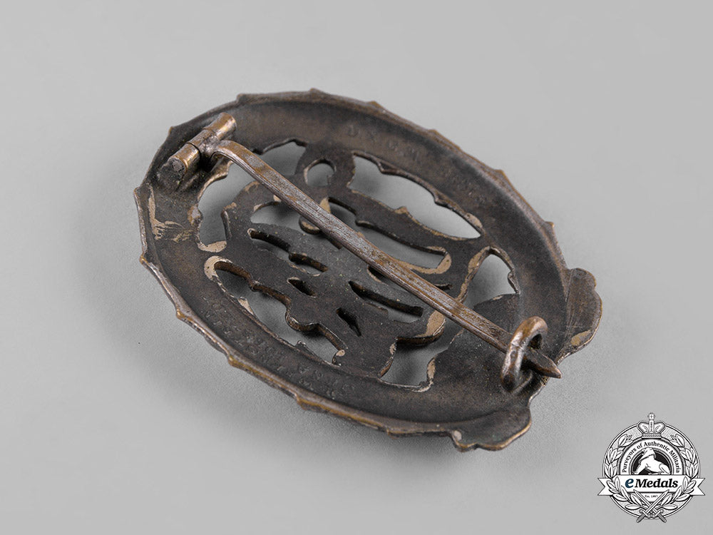 A German National Sport Badge, Bronze Grade, presenting as an oval badge, bearing the initials DRA for Deutscher Reichs-Ausscher, intertwined with and surrounded by an oak leaf wreath with a bow ribbon at the bottom, the reverse bears the maker mark H.WERNSTEIN JENA-LÖBST EDT, D.R.G.M.33918, measuring 39.05 mm (w) x 48.85 mm (h), and in near very fine condition.