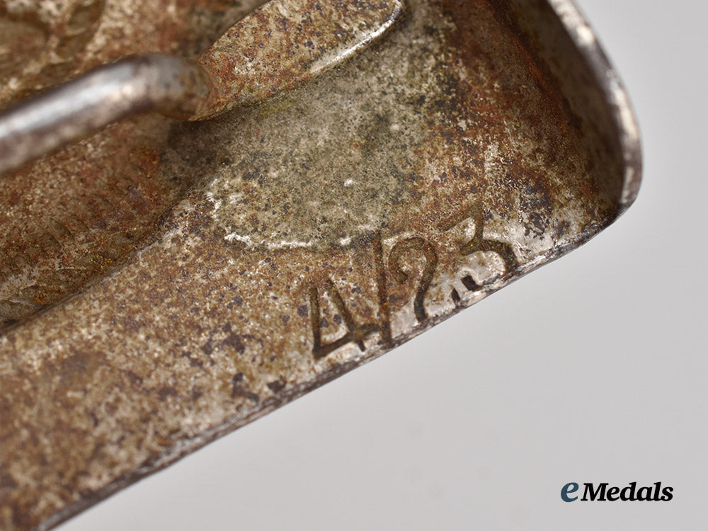 2. An HJ buckle, constructed of nickel-plated magnetic steel, the obverse bearing a central raised German national eagle clutching an HJ insignia, situated within a ribbed ring bearing an inscription of “BLUT UND EHRE” (“BLOOD AND HONOUR”), the reverse with a loop and attachment claws emanating from a functional roller, marked with a Reichszeugmeisterei (RZM) logo and maker code “4/23” for Franke & Co., Lüdenscheid, measuring 60 mm (w) x 48 mm (h), demonstrating moderate loss of nickel plating throughout which has resulted in some surface oxidation, in very fine condition.