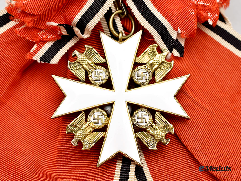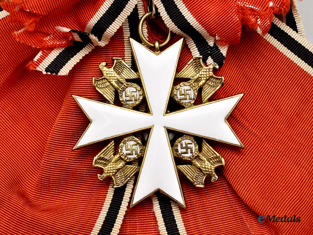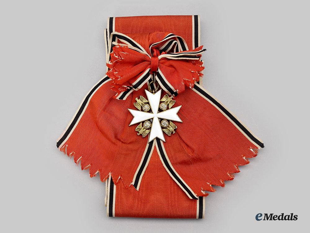 1. A sash cross, constructed of gilded silver with enamels, consisting of a Maltese Cross with white enameled arms, joined together through the quadrants by gilded NSDAP-style German national eagles clutching wreathed mobile swastikas on white enameled discs, the twelve o’clock arm topped by an integral loop and suspension ring connecting to a functional spring clip, the latter embroidered to an original full-length sash ribbon constructed of multi-coloured rayon, the six o’clock arm stamped with a silver content number of “900”, unmarked but demonstrating the physical characteristics of a type one cross produced by the firm of Deschler & Sohn, Munich, measuring 56.52 mm (w) x 56.15 mm (h), weighing 48.0 grams, in extremely fine condition.