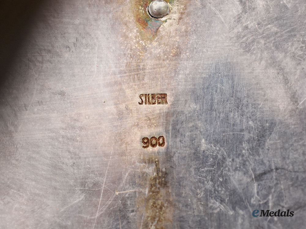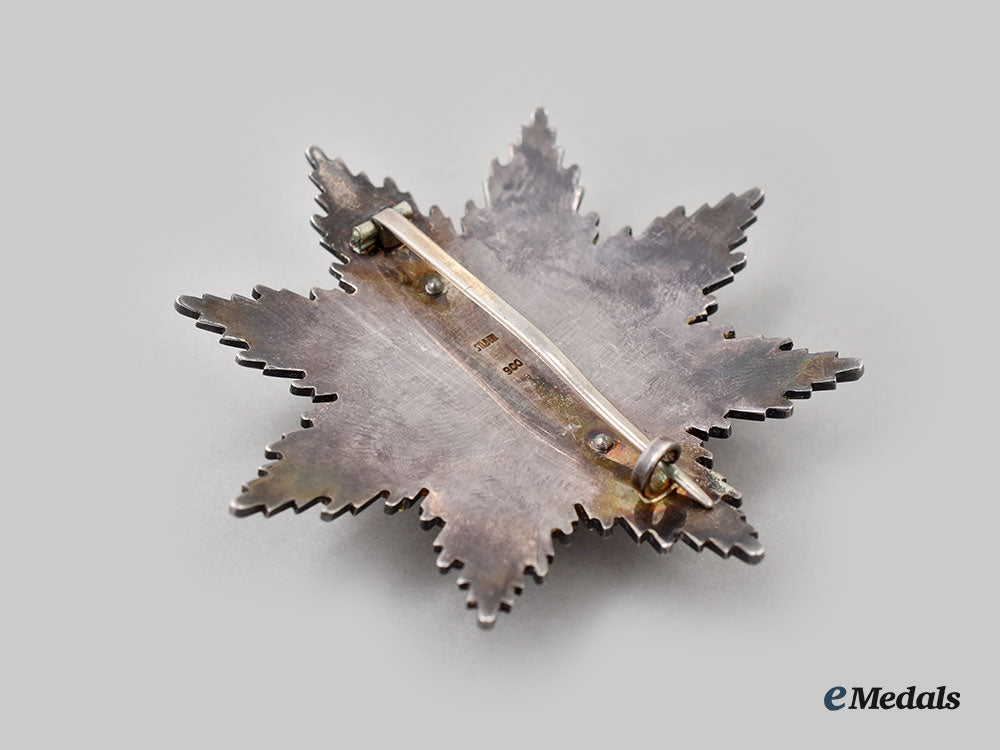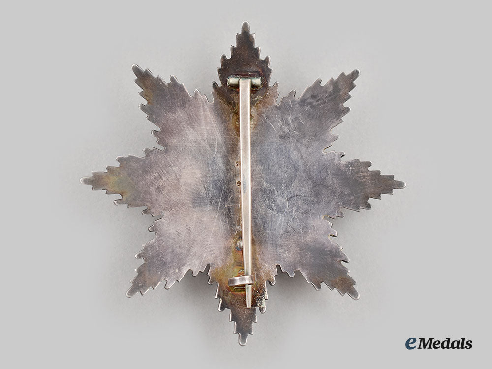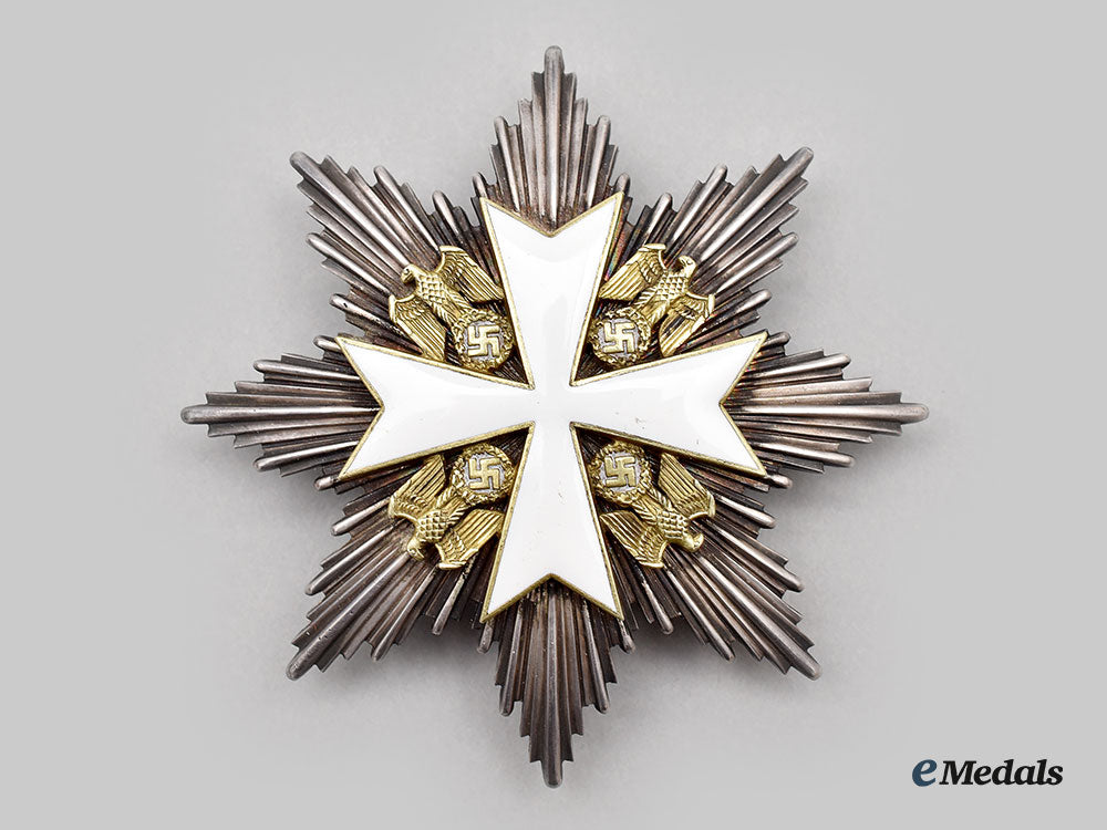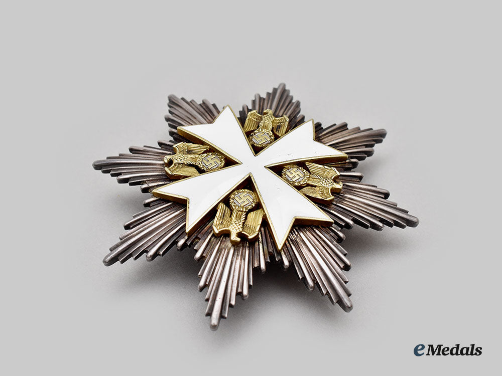 2. A breast star, constructed of silver with gilt and enamels, the obverse consisting of an eight-pointed radiant starburst, bearing a central white enameled Maltese Cross set within a gilt frame, joined together through the quadrants by NSDAP-style German national eagles clutching wreathed mobile swastikas on white enameled discs, the reverse with two visible rivets securing the obverse cross in place with a barrel hinge and tapering vertical pinback meeting a flattened catch, stamped with a mark of “SILBER” and a content number of “900”, otherwise unmarked but demonstrating the physical characteristics of a type one star produced by the firm of Deschler & Son, Munich, measuring 79.21 mm (w) x 78.80 mm (h), weighing 77.4 grams, demonstrating minor flecking to the enamels, in extremely fine condition.