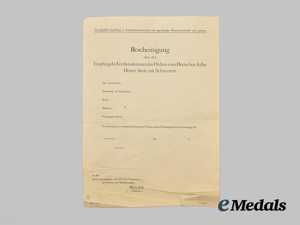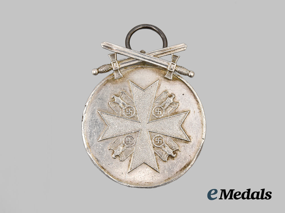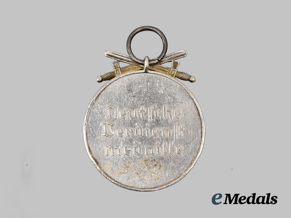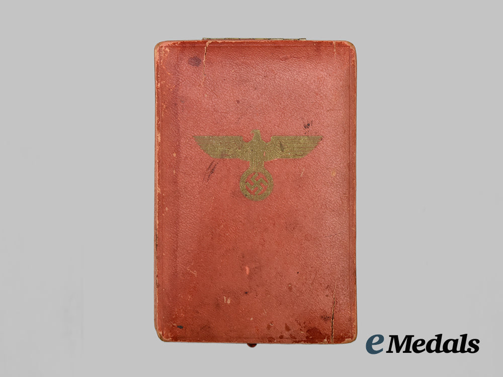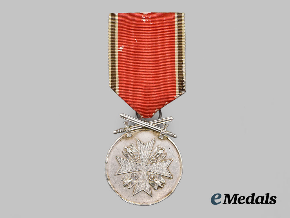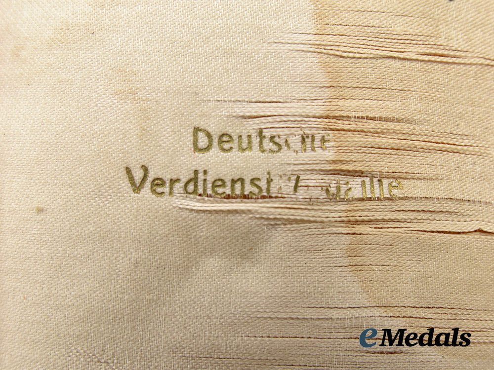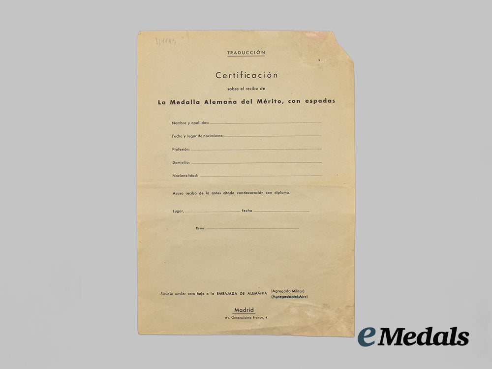 (Deutsche Verdienstmedaille mit Schwertern in Silber in Frakturschrift). Instituted 1 May 1937. (1939-1943 issue). Constructed of silver, the obverse bearing a raised Maltese Cross with pebbled arms, joined through the quadrants by NSDAP-style German national eagles clutching wreathed mobile swastikas, with a crossed sword clasp affixed to the twelve o’clock position, the reverse bearing a raised inscription of “DEUTSCHE VERDIENST-MEDAILLE” (“GERMAN MERIT MEDAL”) in Fraktur script, topped by an integral loop with a suspension ring retaining a period original ribbon with horizontal pinback, the edge stamped with a silver content number of “900”, the medal measuring 38.19 mm in diameter, the swords measuring 31.43 mm (w) x 11.60 mm (h), weighing 25.8 grams, demonstrating edge nicks and the detachment of the ribbon (itself showing fading), in very fine condition, accompanied by its original presentation case, constructed of a wooden frame with a faux red leather exterior liner, the lid bearing a gilt German national eagle clutching a wreathed mobile swastika, the interior with a white rayon lid liner bearing an inscription of “DEUTSCHE VERDIENSTMEDAILLE”, with a depressed black velvet medal bed, closing with a metal spring catch with exterior stud release, unmarked, measuring 78 cm (w) x 115 mm (l) x 24 mm (h), demonstrating fading and material fatigue throughout, in very fine condition, also accompanied by two awards certificates, both constructed of off-white paper with black ink, one executed in German and the other in Spanish (for issue to notable Francoist diplomats or Blue Division personnel), both unspoiled and measuring 21 cm (w) x 29.5 cm (h), demonstrating moderate material fatigue, in overall very fine condition.