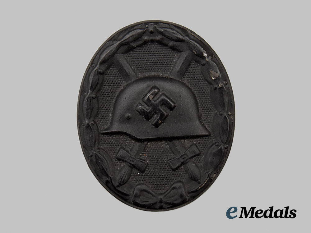 (Verwundetenabzeichen in Schwarz mit Etui). Constructed of blackened magnetic metal, the obverse consisting of an oval laurel leaf wreath, joined together at the bottom by ribbon, with a central raised Stahlhelm overlaid by a mobile swastika, on top of crossed swords on a pebbled field, the reverse with a crimped hinge and vertical pinback meeting a round wire catch, unmarked, measuring 37.11 mm (w) x 44.93 mm (h), weighing 11.7 grams, accompanied by a period case, of two-piece card stock construction, the exterior with a faux dark blue leather liner, the interior lid stamped with an LDO insignia, with a beige felt medal bed, measuring 40 mm (w) x 58 mm (l) x 15 mm (h), demonstrating minor loss of finish to the base, in overall near extremely fine condition.