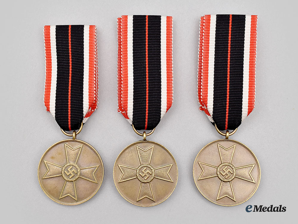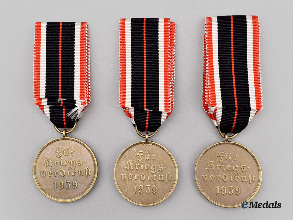 (Kriegs-Verdienstmedaillen). A lot of three War Merit Medals, each constructed of bronze, on loops for suspension from period original ribbons, the obverse of each bearing a raised Maltese Cross with pebbled arms and a central wreathed mobile swastika, the reverse of each bearing a raised inscription of “FÜR KRIEGS-VERDIENST 1939”, all unmarked, measuring 32 mm in diameter, in overall extremely fine condition.