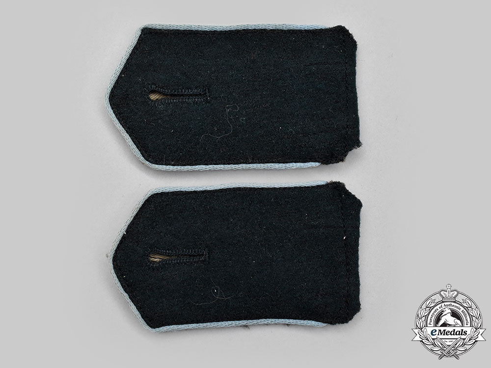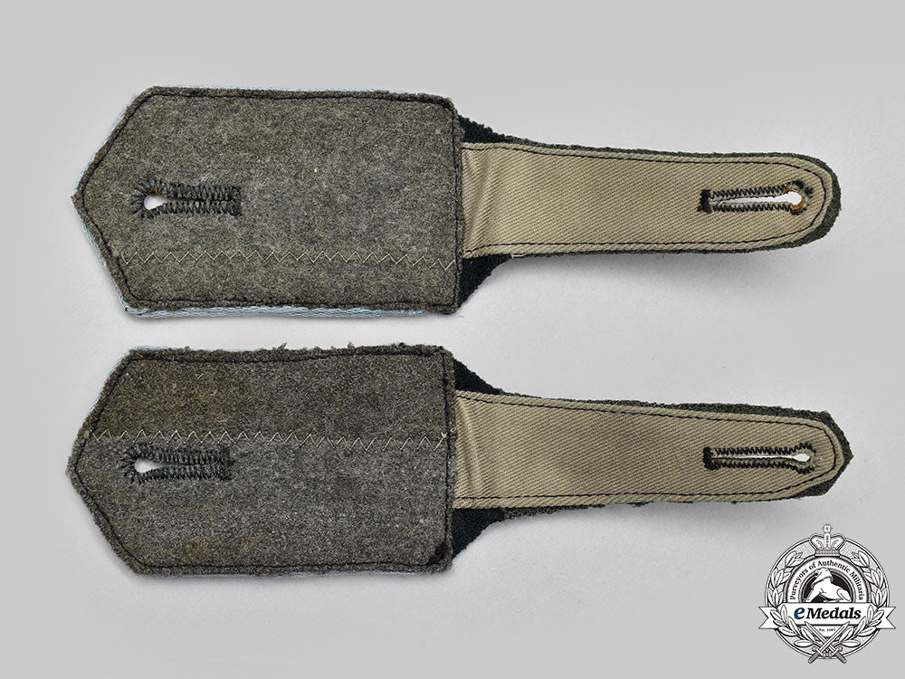(Wehrmacht Schulterklappen für Männer der Russische/Ukrainische Befreiungsarmee). A mint set of Russian/Ukrainian Liberation Army Enlisted personnel shoulder straps, ech constructed of dark green wool and trimmed with light blue piping, the reverse of each with an integral strap bearing a reinforced buttonhole, both unmarked and measuring 55 mm (w) x 100 mm (l), in unissued and near mint condition.