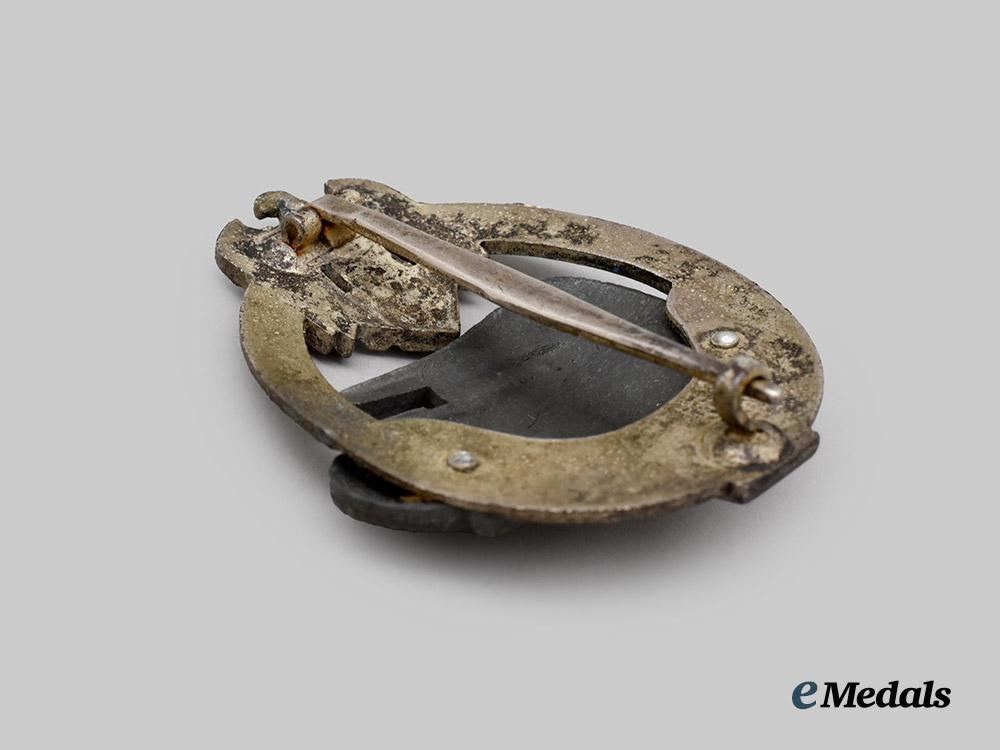 (Panzerkampfabzeichen mit Einsatzzahl “50”). Constructed of silvered and patinated zink, the obverse consisting of an oval oak leaf wreath, joined together at the bottom by a plaque bearing a raised number “50”, topped by a Heer-style German national eagle clutching a mobile swastika, surrounding a central Panzer IV rolling over logs, with its left tread extending beyond the edge of the wreath, the reverse with two visible rivets securing the Panzer in position, with a barrel hinge fitted into a crimped base and banjo-style pinback meeting a flat wire catch emanating from a crimped circular base, unmarked but demonstrating the characteristics of manufacture by Josef Feix & Söhne, Gablonz, demonstrating minor loss of silver finish to the base metal, a rare high-grade example produced in the mid- to late-war era in extremely fine condition.