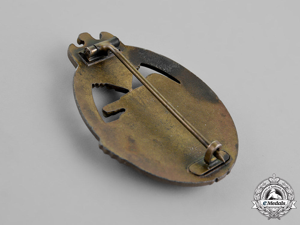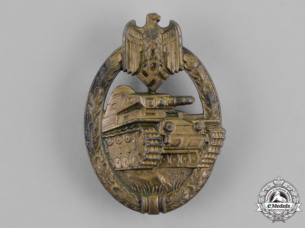 (Panzerkampfabzeichen in Bronze). Constructed of oval shaped bronzed zink; the obverse with a border of oak leaves with a tie at the base and a Panzerkampfwagen IV superimposed in the centre on grassy ground, with its left tank track extending over the edge of the badge; the reverse plain with a vertical needle style pin, a crimped sheet metal hinge, and a crimped round wire catch; measuring 42.27 mm (w) x 60.08 mm (h); weighing 29.1 grams; better than very fine condition.