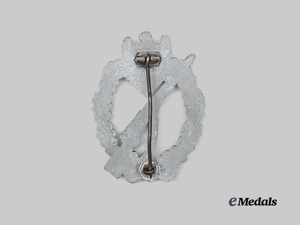 (Infanterie-Sturmabzeichen in Silber). Constructed of silvered zink, the obverse consisting of oval oak leaf wreath, joined together at the bottom by ribbon, topped by a Heer-style German national eagle clutching a mobile swastika, the reverse with a crimped barrel hinge and vertical pinback meeting a maker-atypical flat wire catch, maker marked with LDO code “L/56” for Funcke & Brüninghaus, Lüdenscheid, measuring 48.0 mm (w) x 64.5 mm (h), weighing 38.4 grams, with minor oxidation and loss of finish evident, in good condition.