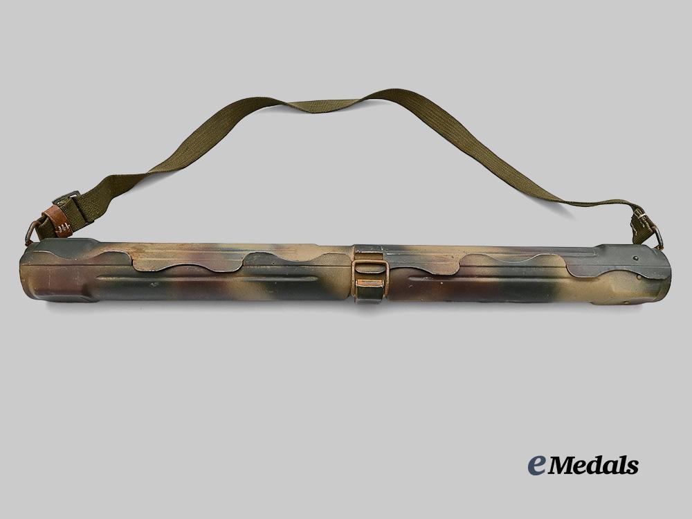 (Laufschützer 42). A rare Maschinengewehr 42 (MG 42) barrel carrier, constructed of a two-piece magnetic metal shell with a three-tone camouflage paint scheme throughout the exterior, opening with a functional hinge to reveal a hollow interior, in turn fastening closed with a retractable clip, each end retaining a magnetic metal loop for the accommodation of an olive-drab canvas carrying strap, one end bearing a white highlighted inscription of “LAUF-SCHÜTZER 42” and a partially-legible maker’s code with a date of “43”, measuring 58 cm in total length, the exterior camouflage is likely a refurbishment consistent with postwar usage, while the unspoiled interior demonstrates some surface oxidation, an accessory to one of the most iconic machine guns of the Second World War, in better than very fine condition.