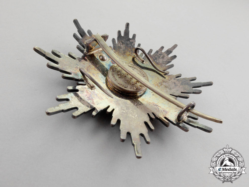 | Greece; Multi-piece construction, silver gilt with blue, green and black enamelled insignia, along with a handpainted centrepiece illustrating the Holy Sepulchre in Jerusalem, inscribed on the centrepiece ring in Greek "ΕΝ ΤΟΥΤΩ, ΝΙΚΑ" (In This Sign You Will Win) above and "ΙΕΡΟΥΣΑΛΗΜ ΜΗΤΗΡ ΕΚΚΛΗΣΙΩΝ" (Jerusalem Mother of the Churches) below, mounted to a silver eight-pointed star base, boar's head hallmarked on the pin, maker marked "LEMAITRE PARIS" on the reverse cartouche, 85.5 mm (w) x 84.5 mm (h), vertical pinback flanked by dual prongs, intact enamels, extremely fine. Footnote: The Order of the Orthodox Crusaders of the Patriarchy of Jerusalem was instituted in 1925. It is not connected to the Greek State, but directly awarded by the Head of the Greek Orthodox Church, kept in the highest consideration and importance. It is awarded to the highest personalities, in recognition of outstanding merits in the defence of Christianity. |