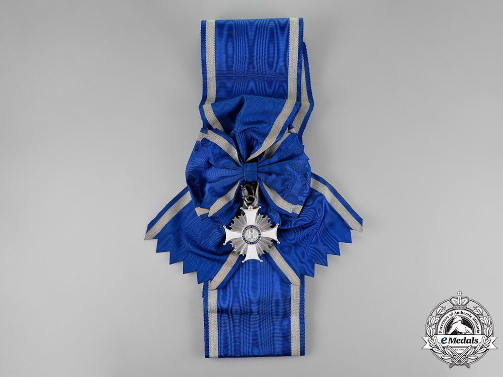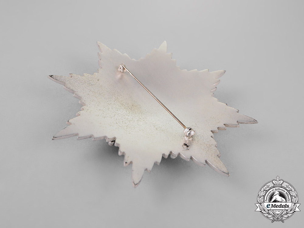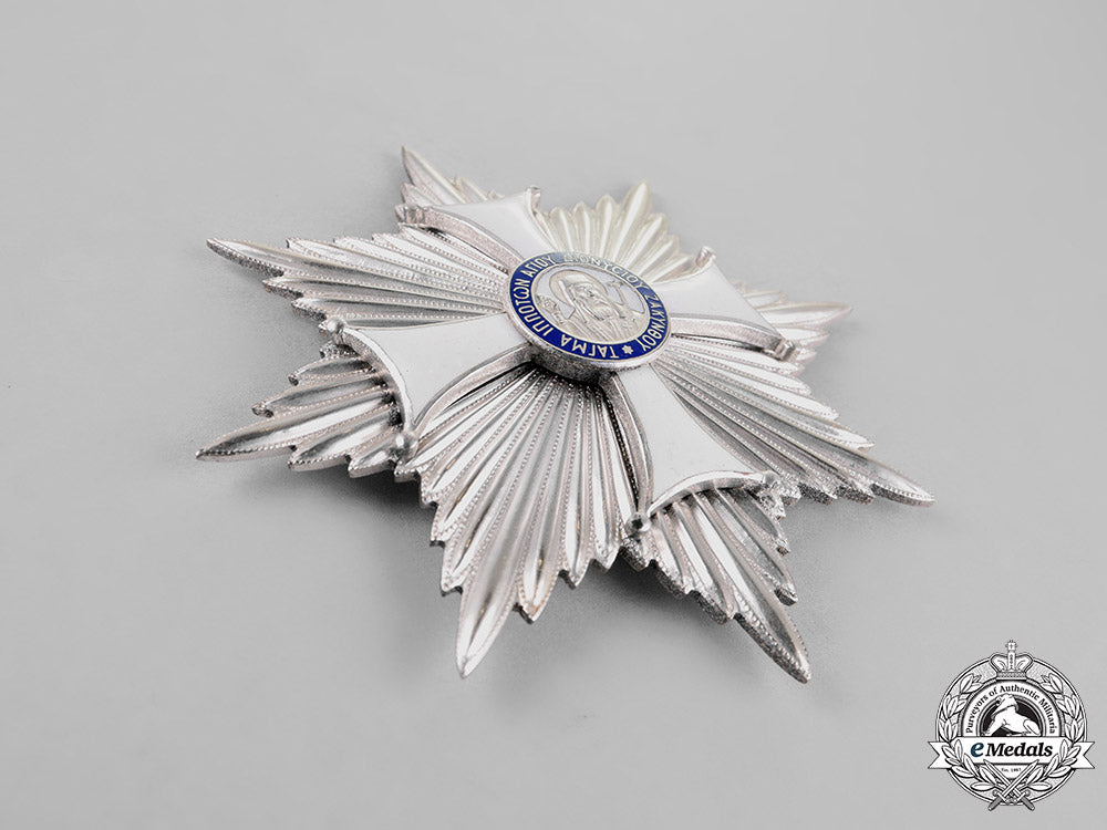 Badge: in silver with navy blue and white enamels, measuring 55.2 mm (w) x 56.7 mm (h), on its original full-length sash; and Breast Star: in silver with navy blue and white enamels, measuring 92 mm (w) x 92.5 mm (h), vertical pinback. Intact enamels, extremely fine.