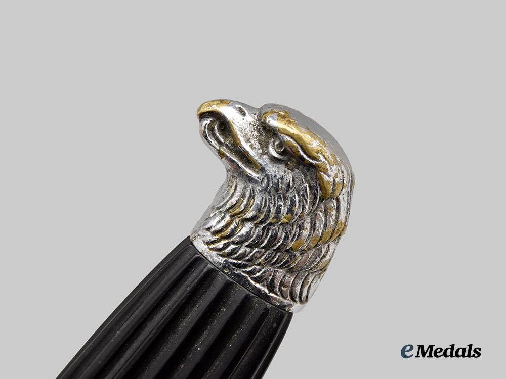 A Model 1932 Royal Hungarian Air Force Officer’s dagger, measuring 37.5 cm in total length when inserted into the scabbard. It features a 20.5 cm-long, nickel-plated, stiletto-style magnetic steel blade. The obverse ricasso bears a maker’s mark of “MÉSZÁROS LAJOS” for the prolific Budapest-based manufacturer of Hungarian edged weapons. The blade sits securely within an elaborate gilded and silvered brass crossguard with downturned quillons and an elaborate raised Hungarian national eagle on the obverse. Inset into the centre of the reverse is a functional push button which connects to a clip which emerges directly adjacent to the ricasso to release the scabbard lock. A single piece of ribbed black ebony composes the handle grip, while the dagger culminates with a pommel in the form of a double-sided eagle’s head, executed in nickel-plated brass, which screws in to maintain its structural integrity. It is accompanied by its original scabbard, constructed of a tapering nickel-plated brass shaft. A raised Hungarian coat of arms emerges from the obverse just below the crossguard, and is situated within a radiant and pebbled frame. Also emanating from the edge of the shaft are dual rings for the accommodation of a hanger. A catch set into the throat’s opening locks onto the scabbard’s clip to hold the dagger in place during storage. Some issues consistent with age and wear are evident, and include running marks to the blade with additional blunting of the tip and edges, some loosening of the hilt, and minor loss of nickel to the plated fixtures. It remains in an overall better than very fine condition.