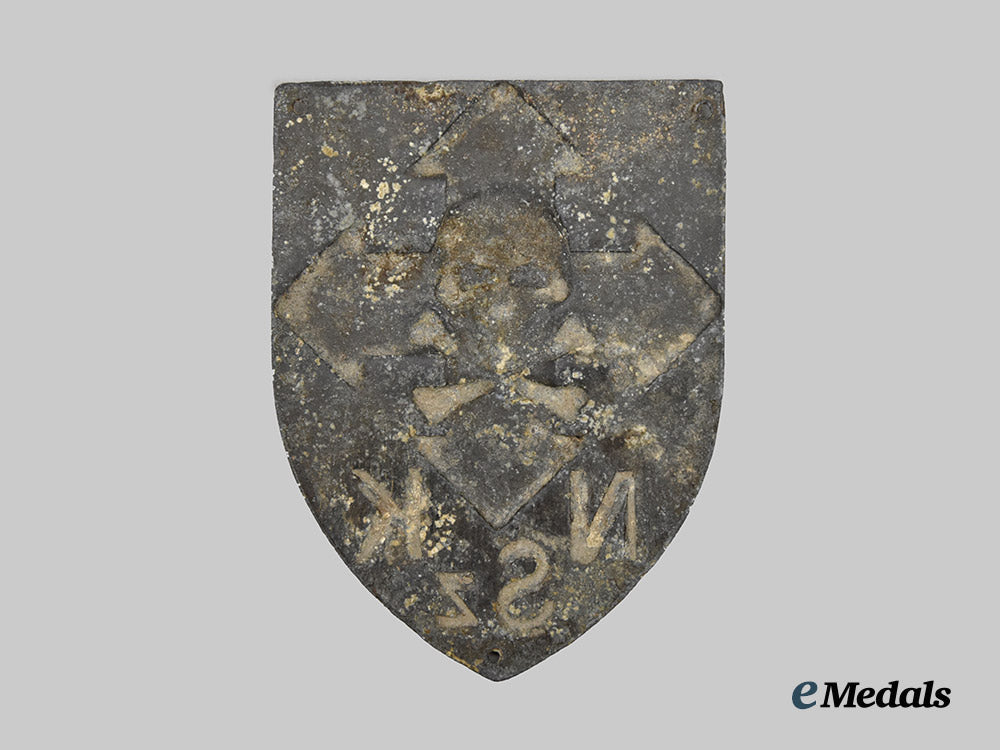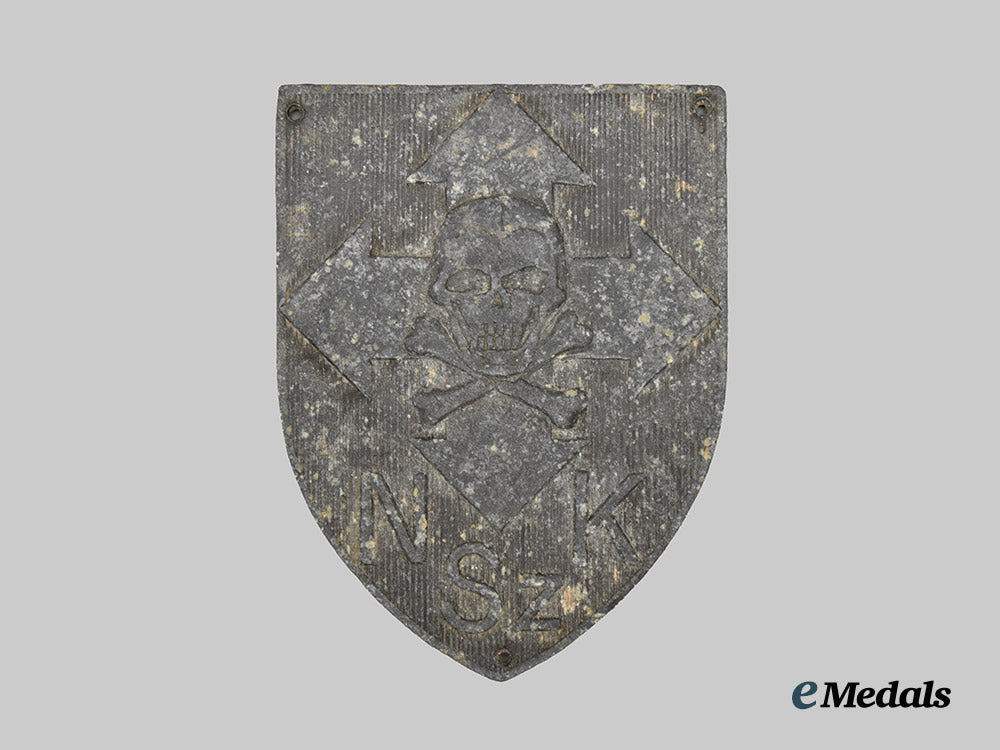 Constructed of zink, the obverse consisting of a ribbed shield, bearing a raised Arrow Cross overlaid by a skull and crossbones, situated above an initials “NSZK” for Nemzeti Számonkérés Központja (National Reckoning Centre), perforated with three holes for sew-on attachment, unmarked, measuring 43 mm (w) x 57 mm (h), demonstrating moderate surface oxidation throughout, an exceptionally rare insignia in better than very fine condition.