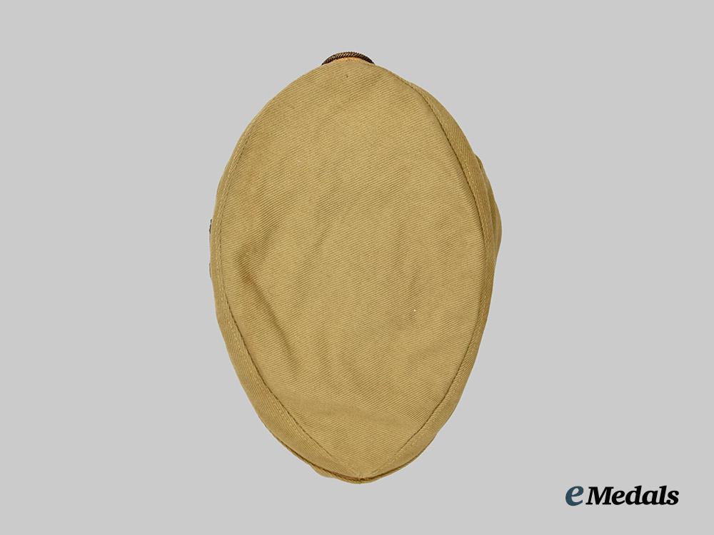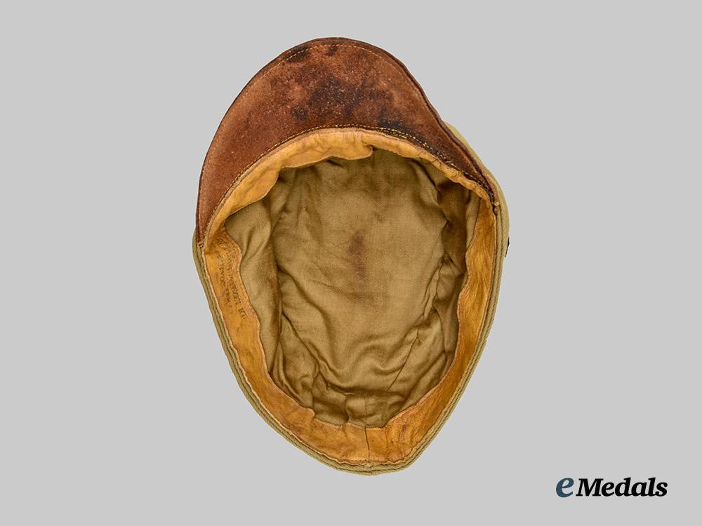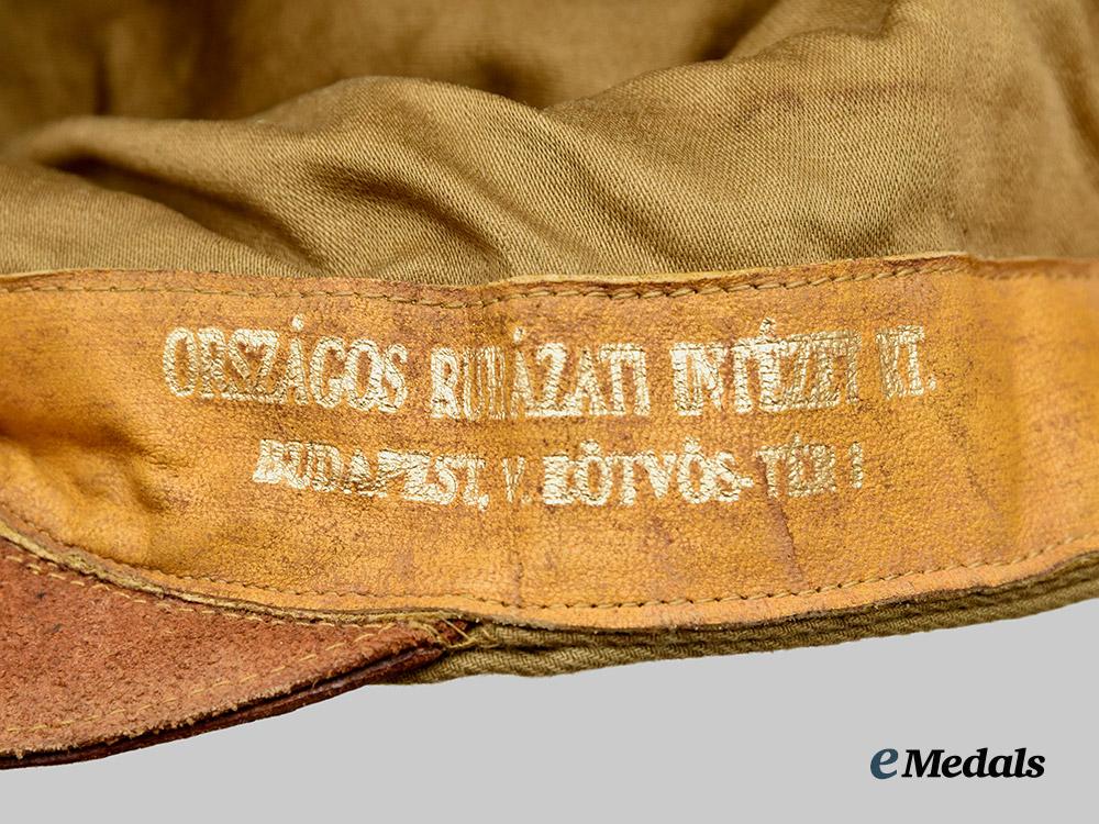 A well-preserved Royal Hungarian Air Force service cap, constructed of light olive-drab wool cloth. It is fully surrounded by fold-down side panels which are scalloped at the front, and which secure in place with two bronzed magnetic metal buttons. Stitched onto the left panel is an insignia consisting of a black wool base bearing a bronze Air Force insignia in the form of a finely-detailed Hungarian national eagle topped by the Holy Crown of Hungary, measuring 70 mm (w) x 45 mm (h) overall. Stitched onto the peak is a cockade consisting of a stepped gold bullion wire base overlaid by a centrepiece painted in a red, white, and green Hungarian tri-colour, measuring 35 mm in diameter. Six gold bullion wire tresses descend from the lower edge of the cockade to form chevron. Completing the exterior features is a protruding visor constructed of pressed brown leather. The interior is surrounded by a tan-coloured leather sweatband, and fully encompassed by a multi-piece olive-drab rayon liner. The right side of the sweatband bears a maker’s mark of “ORSZÁGOS RUHÁZATI INTÉZET RT.”, indicating manufacture by the National Clothing Depot in Budapest. Measuring approximately 17 cm (w) x 24 cm (l) x 14 cm (h), the cap demonstrates issues consistent with age and field wear, including minor soiling to the exterior cloth, material fatigue of the visor, and additional soiling throughout the interior liner. This scarce example remains in a better than very fine condition.