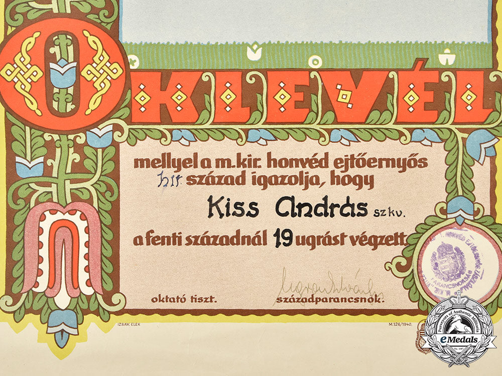 Hungary, Kingdom. An Army Parachutist Certificate For Nineteen Jumps To András Kiss