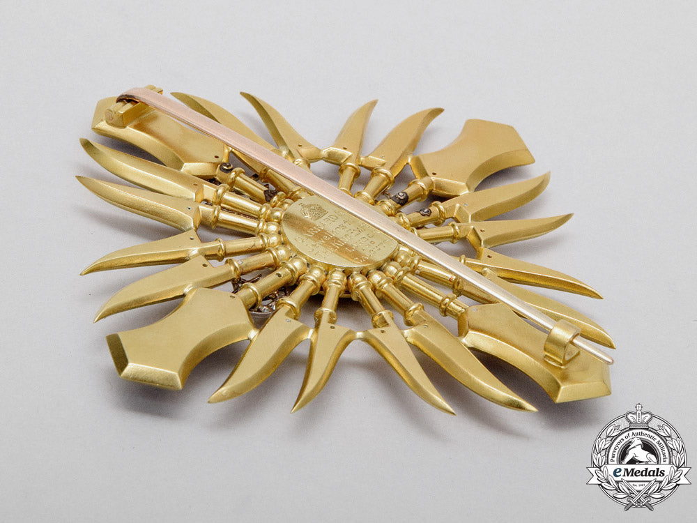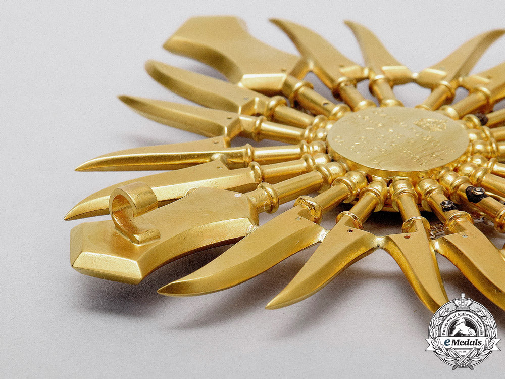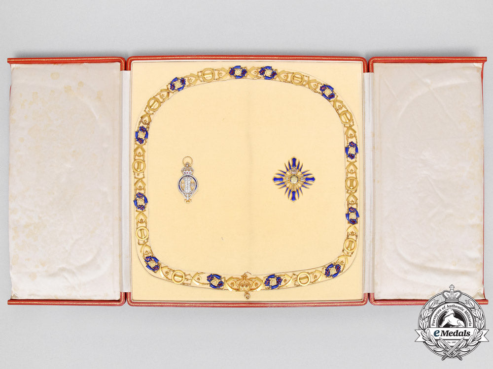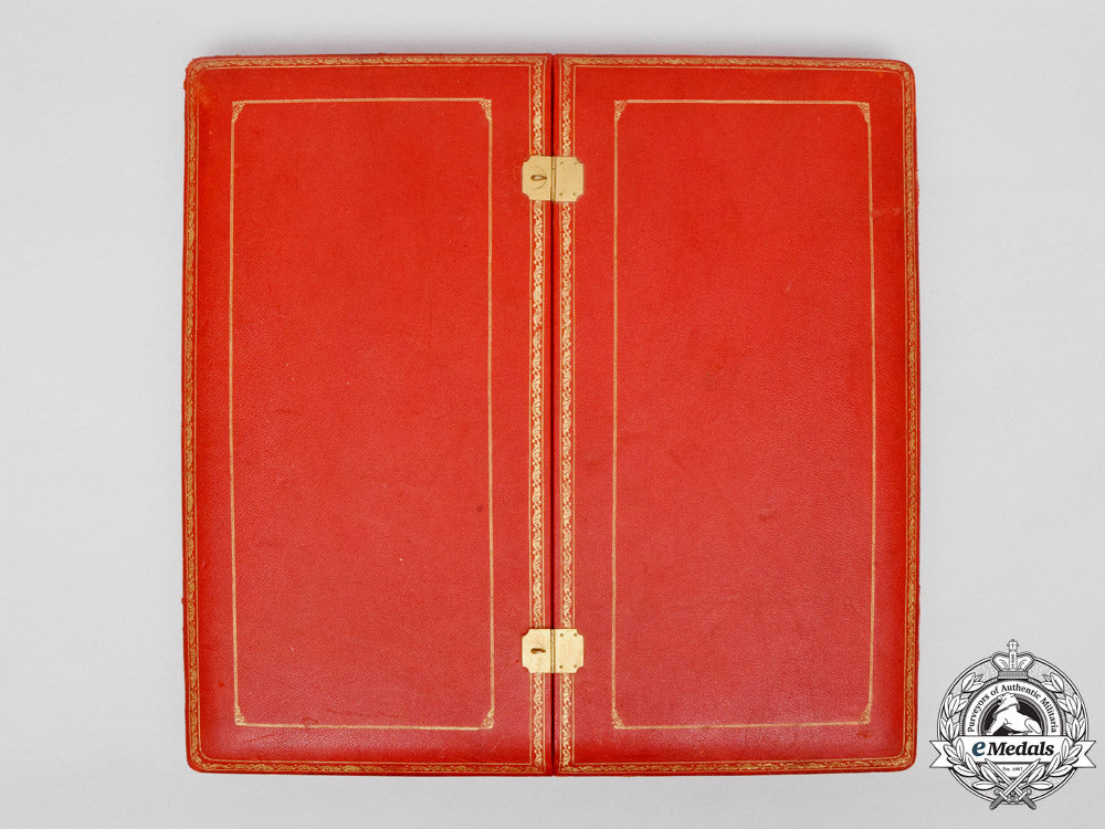 In a custom hardshelled case of issue, the front designed with two doors that are each dual-hinged on either side, and when opened, expose a recessed medal bed for the Badge on the left side and a slot for the Breast Star on the right side, the two awards surrounded by a recessed channel housing the Collar Chain, the covering of the presentation area in a fine cream-coloured felt, the insides of both doors lined in a padded white satin, the doors secured in place when closed via two clasps with twist closures on top, measuring 535 mm x 535 mm x 56 mm deep, the exterior exhibiting scuff marks and light wear, with soiling evident in the padded white satin lining on both doors, case very fine.