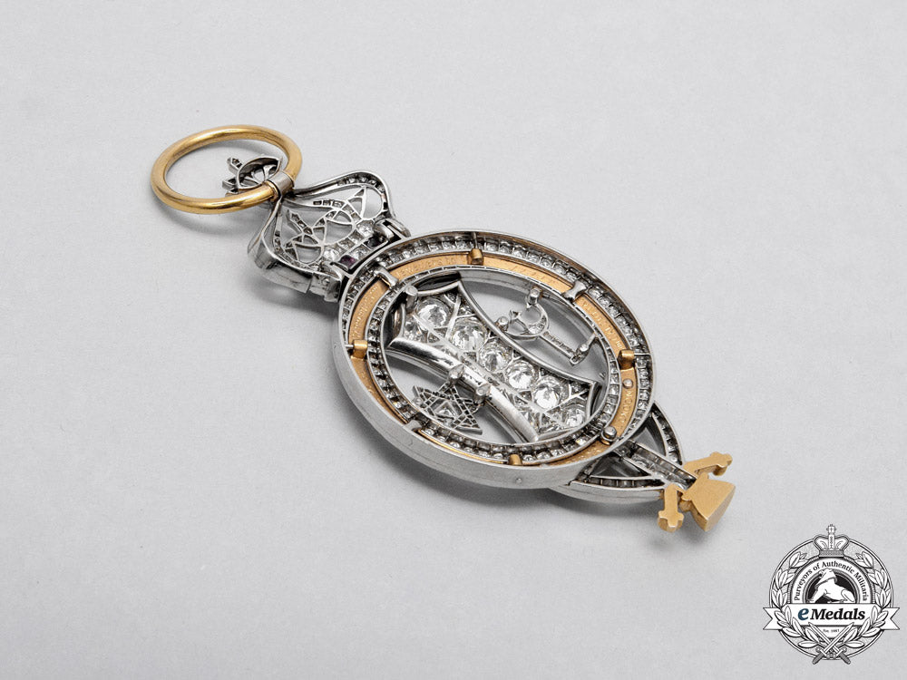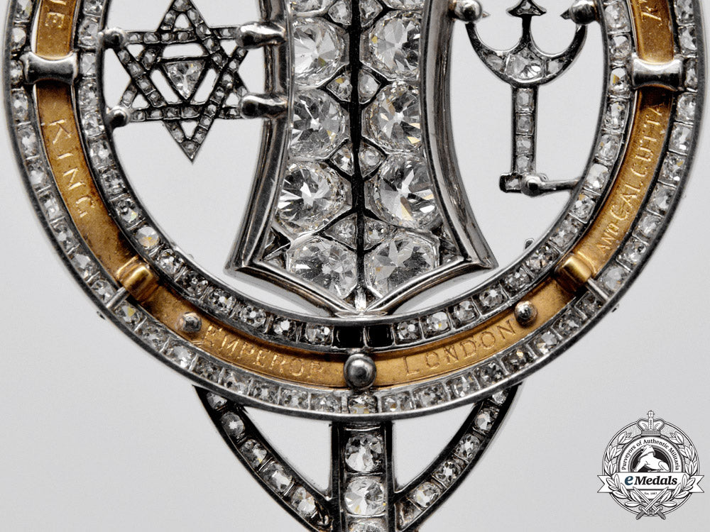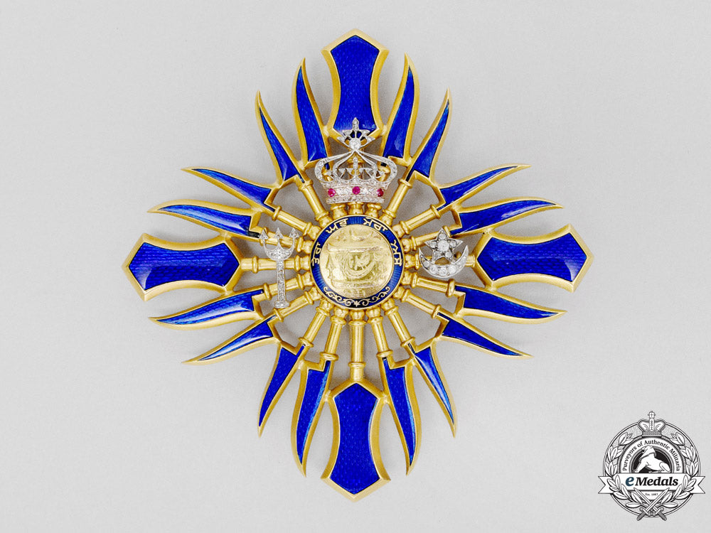 Footnote: Although no statutes have been found for the Order, nor has it been determined as to whom it was awarded, it was almost certainly instituted by Maharaja Sir Bhupendra Singh, GCSI, GCIE, GCVO, GBE, the ruling Maharaja of the princely state of Patiala, from 1900 to 1938. It is believed that the Order was only intended for male members of Patiala or related Royal Families and it is possible that the diamond encrusted version was worn uniquely by Bhupendra Singh during grand ceremonies, while the gold and enamel version was worn by him on less formal occasions. Although no ribbon has been identified, it is possible that it would have been dark blue with gold stripes, these being the colours of Patiala State and of the decorations themselves. Maharaja Sir Bhupendra Singh, GCSI, GCIE, GCVO, GBE was born Bhupinder Singh at the Moti Bagh Palace, in Patiala, a city in southeastern Punjab, in northern India, on October 12, 1891 and was educated at Aitchison College in Lahore. At the age of nine, he succeeded as Maharaja of Patiala state upon the death of his father, Maharaja Rajinder Singh, on November 9, 1900. A Council of Regency ruled in his name until he took partial powers shortly before his eighteenth birthday on October 1, 1909 and was invested with full powers by the Viceroy of India, the 4th Earl of Minto, on November 3, 1910. He served on the General Staff in France, Belgium, Italy and Palestine during the First World War, as an Honourary Lieutenant-Colonel, later promoted to Honourary Major-General in 1918 and Honourary Lieutenant-General in 1931. He represented India at the League of Nations in 1925, and was Chancellor of the Indian Chamber of Princes for ten years, between 1926 and 1938, and was also a representative at the Round Table Conference. He married many times and had many children by his wives and concubines. Maharaja Sir Bhupinder Singh was the first man in India to own an aircraft, which he bought from the United Kingdom in the first decade of the twentieth century. He subsequently had an airstrip built at Patiala to accommodate the aircraft. He was well known for the construction of buildings with bold architectural designs in Patiala, including Kali Temple, Patiala, and Chail View Palace in the summer retreat of Kandaghat, along with Chail Palace and Oak Over and Cedar Lodge in Shimla, which now houses the Chief Minister of Himachal Pradesh and Punjab State Guest House, respectively. He is perhaps the most famous Maharaja of Patiala, best known for his extravagance and for being a cricketer and sportsman. He was also known for an exceptional collection of medals, believed to be the world's largest at the time. According to legend, Maharaja Sir Bhupinder Singh would be driven in a motorcade of twenty Rolls Royce cars. He had a unique monorail system built in Patiala known as Patiala State Monorail Trainways. He had the world's highest cricket pitch built, at 2,443 metres in 1893 at Chail. His then Education Minister, Pt. Makhan Lal Banerjee, accompanied him to the summer capital of Chail and was also a well-known referee in cricket. His cricket and polo teams, Patiala XI and Patiala Tigers, were among the best of India. He was Captain of the Indian cricket team that visited England in 1911 and played in twenty-seven first-class cricket matches between 1915 and 1937. In the 1926-1927 season, he played as a member of Marylebone Cricket Club. He donated the Ranji Trophy in honour of Kumar Shri Ranjitsinhji, Jam Sahib of Nawanagar. He was selected as the Captain of India on its first Test Tour of England in 1932, but dropped out for reasons of health two weeks before departure, with the Maharaja of Porbandar taking his place. Maharaja Sir Bhupendra Singh's other noted accomplishments included: donating most of the buildings of Chail Military School at Patiala to the Government of India, founding the State Bank of Patiala in 1917, serving as the Chancellor of the Chamber of Princes from 1926 to 1931 and working tirelessly for his subjects' betterment, which included the introduction of many social reforms in Patiala. He married five times and had numerous consorts.