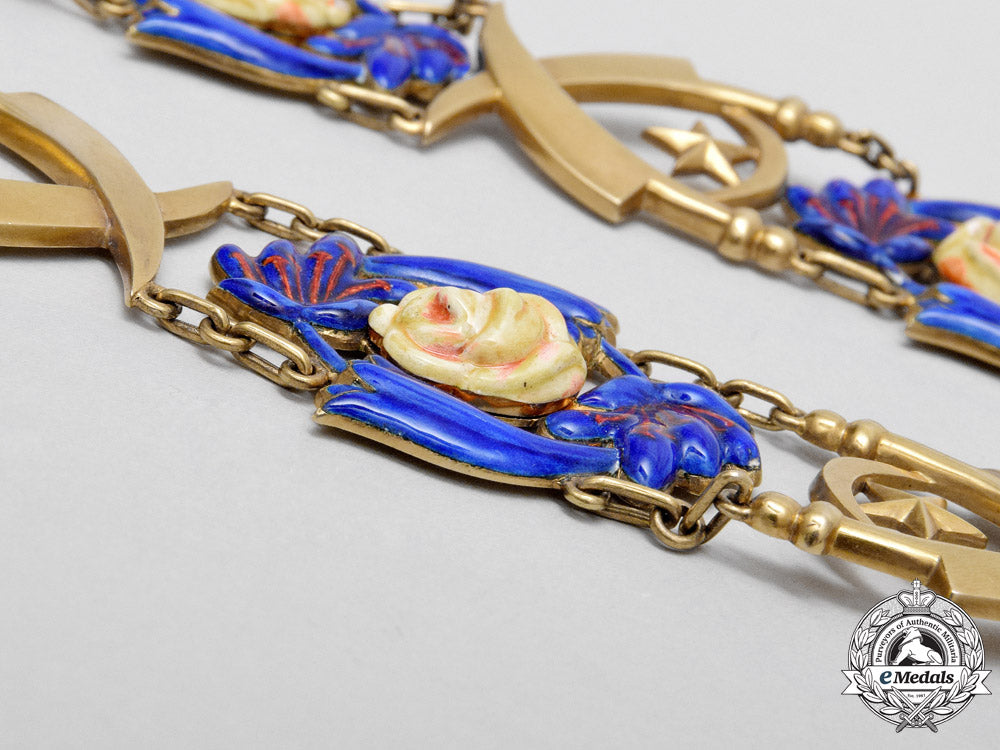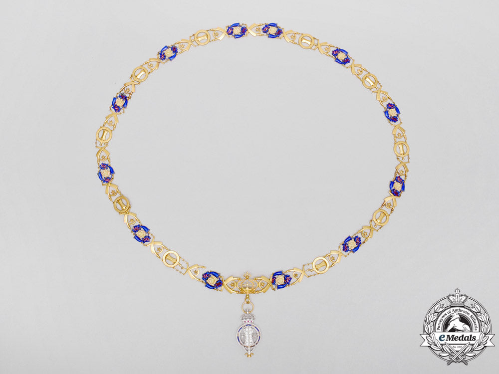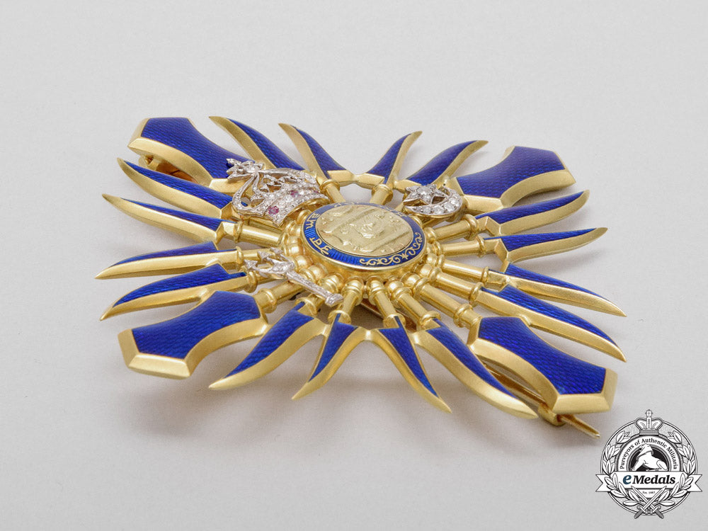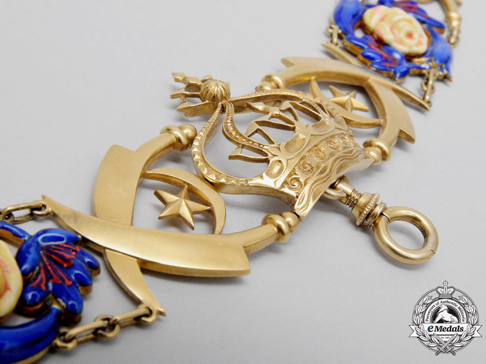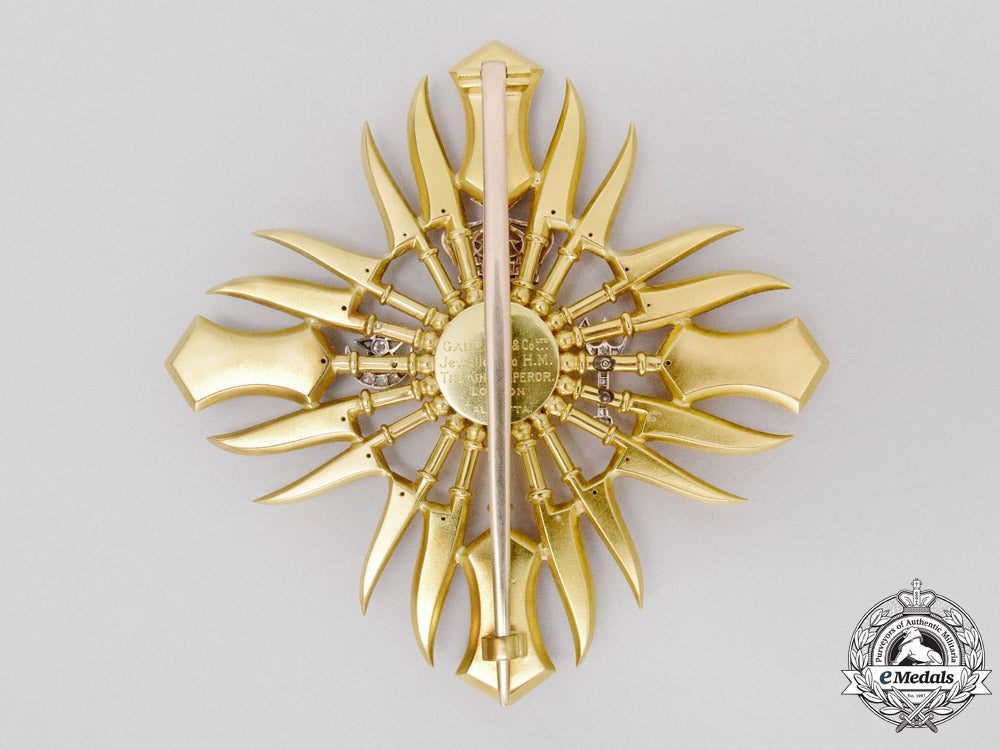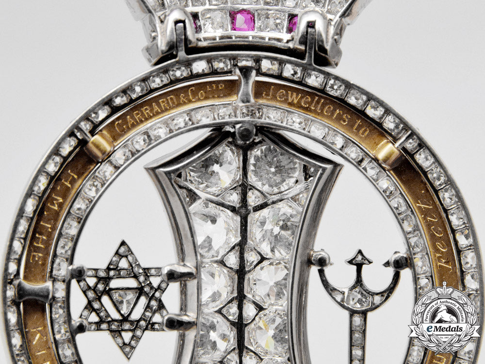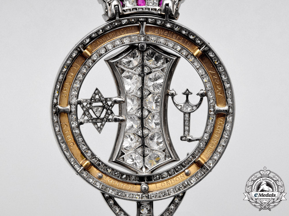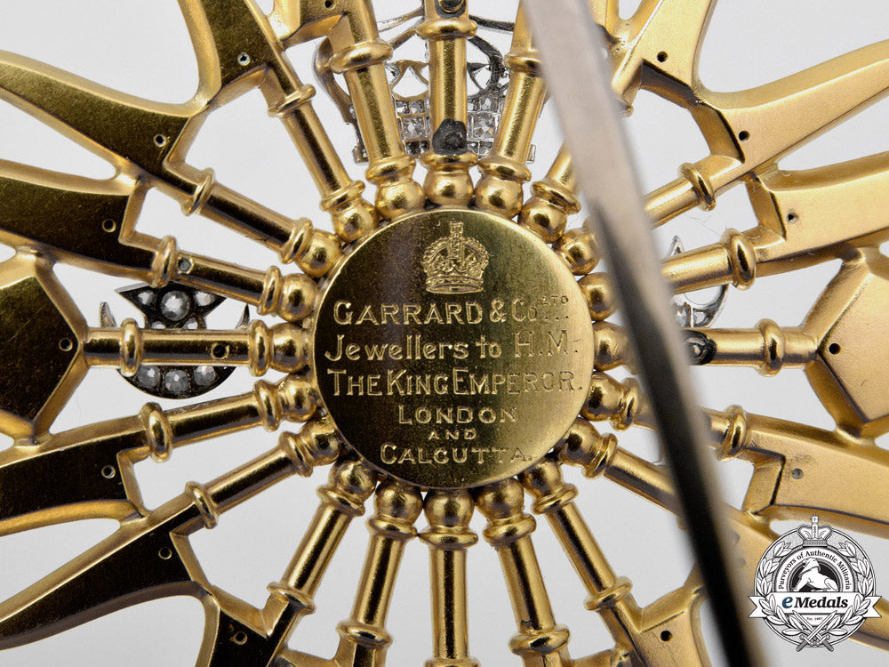An Indian State of Patiala Royal Family Order (Nishan-i-Phul) Collar Chain with Badge and Breast Star, Cased, unique, and attributed to Maharaja Sir Bhupendra Singh, GCSI, GCIE, GCVO, GBE. Of the highest possible quality and craftsmanship. With an absolute attention to detail and care, the collar set of Maharaja Sir Bhupendra Singh stands alone as a example of genuine superiority. Each individual component is meticulously made in 22 Kt yellow Gold, the twelve flowers with red, white and blue enamels added, unmarked, tested, weighing 488 grams, the chain composed of a 38.5 mm x 39 mm Gold Royal crown, designed with a swivelling suspension ring for the Badge, the chain with alternating icons consisting of ten 30 mm diameter Gold circular Quoits, each of which encompasses a dagger and twelve 29.5 mm x 39.5 mm Gold with red, white and blue enamelled flowers, each of the twenty-two aforementioned icons framed by 27 mm x 35.3 mm Gold crossed Kirpans framing a star and an upward-pointing crescent moon, the two crossed Kirpans flanking the enamelled flowers furthest from the Royal crown on either side are slightly larger at 29 mm x 43 mm, as they incorporate a trident, as well as the star and an upward-pointing crescent moon, the Kirpans totalling twenty-three in number, one of which sits directly behind the neck and is flanked by flowers on either side, each of the icons with four loops attached, two on either side, each joined together by either one or two elongated Gold links, the chain measuring approximately 1,700 mm in length, the enamels intact on all twelve flowers, with one Gold link missing on the left side of the flower where it connects to the right side of the crossed Kirpans with trident and upward-pointing crescent moon icon, to the left of the Royal crown; Badge: multi-piece construction, in 22K yellow Gold, Platinum with blue enamels, weighing 31.5 grams, obverse centre set with 12 larger round old European cut genuine Diamonds, weighing from approximately 0.50 ct to 0.75 ct each, for a total approximate weight of 7.2 carats, further encrusted with approximately 276 round old European cut genuine Diamonds, weighing approximately 7.5 carats in total weight, all diamonds are of white colour and average VS-SI clarity, the crown also set with three genuine Rubies, illustrating a dagger above two crossed Kirpans, flanked by a trident on the left and a six-pointed star on the right, an inscription in Gold on the blue enamelled garter, inscribed in Gurmukhi "Tera gharu mera asay" (Your home is my refuge) and surmounted by the Royal crown, reverse of the garter engraved with the maker mark "GARRARD & Co. Ltd. Jewellers to H.M. THE KING EMPEROR. LONDON AND CALCUTTA. Fecit.", 44.5 mm x 85 mm, designed with a large Gold ring for suspension from the Collar Chain; and Breast Star: multi-piece construction, in 22K yellow Gold with blue enamels, set with 82 genuine old European cut Diamonds and three Rubies, weighing 75.5 grams, obverse illustrating four large daggers, with each quadrant set housing four smaller knives, all of which radiate from a central medallion, inscription in Gold on the blue enamelled medallion, inscribed in Gurmukhi "Tera gharu mera asay" (Your home is my refuge), the medallion surrounded by three icons in Platinum with Diamonds, the Royal crown above, with a trident to the left and a five-pointed star resting upon an upward-facing crescent moon to the right, reverse cartouche engraved with the maker mark "GARRARD & Co. Ltd. Jewellers to H.M. THE KING EMPEROR. LONDON AND CALCUTTA.", 95 mm x 95.5 mm. All three pieces are of superb quality manufacture, with intact enamels, near mint.